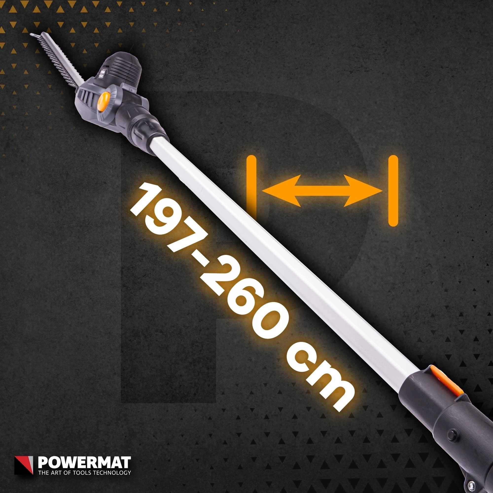 Ножницы с аккумуляторной стойкой с регулировкой наклона на 11 градусов с помощью POWERMAT PM-NAW-20C и лезвием из высококачественной высокоуглеродистой стали. Возможность быстро и легко регулировать длину штанги в диапазоне от 197 см до 260 см и возможность регулировки угла наклона ножниц в одиннадцать градусов делают обрезку кустов очень легкой. Электродвигатель с аккумулятором 20В - 2Ач позволяет обрезать ветки толщиной до 16 мм