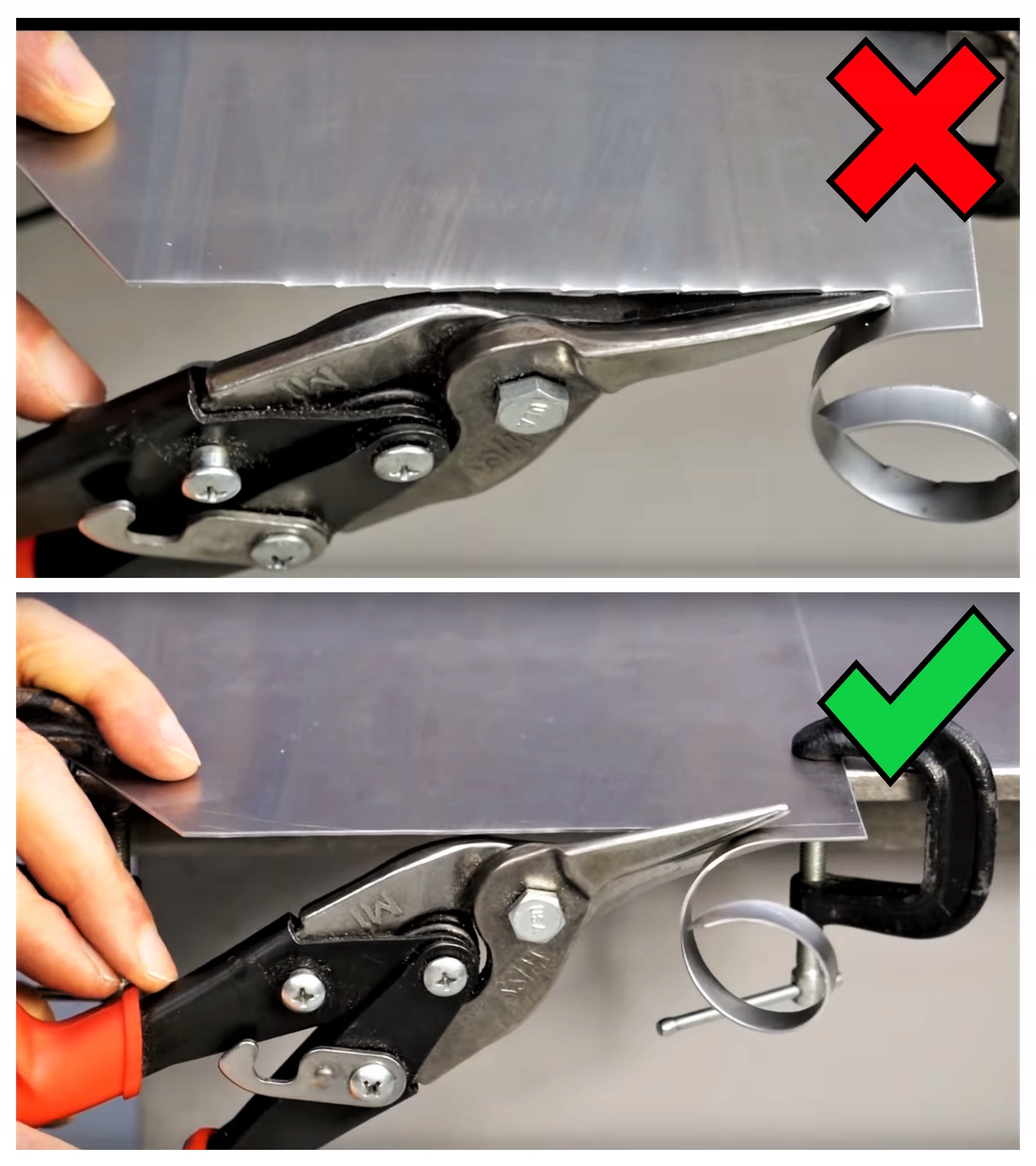 При резке не сжимайте ручку до ее закрытия — это приведет к перекрытию кончиков лезвий инструмента, что, в свою очередь, приведет к перекрытию. приведет к образованию углублений в листах (как видно на фото вверху). Вместо этого сжимайте ручки до тех пор, пока между лезвиями и листом не останется несколько миллиметров пространства, затем ослабьте давление. Это поможет обеспечить гладкий и прямой срез, как вы можете видеть внизу фотографии.