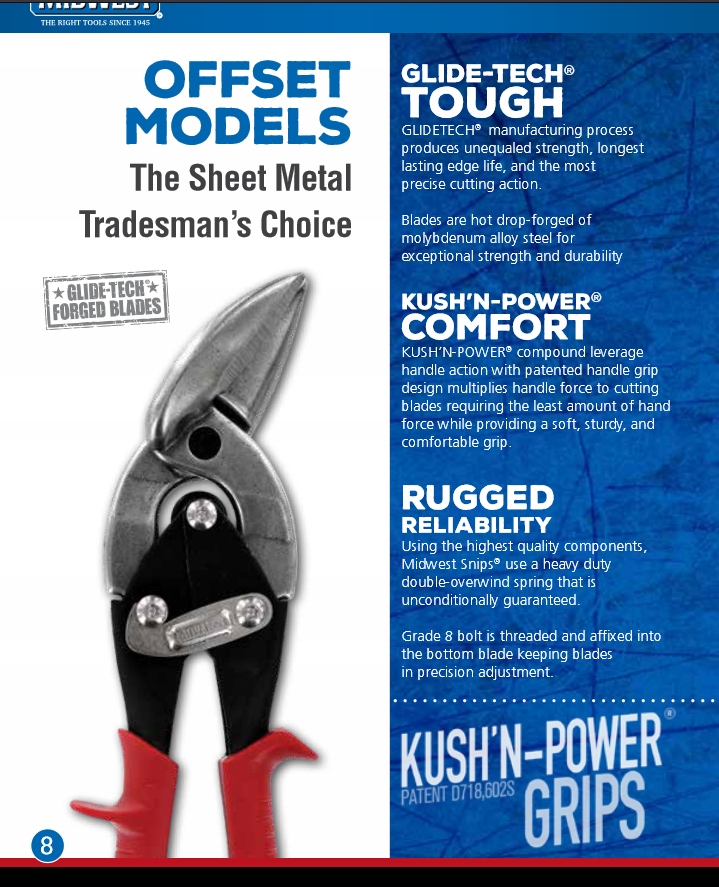 Конструкция ножниц со смещением Midwest® позволяет расположить руку над разрезаемым материалом в идеальном положении, обеспечивая плавность и безопасную маневренность при выполнении длинных разрезов или крутых дуг.