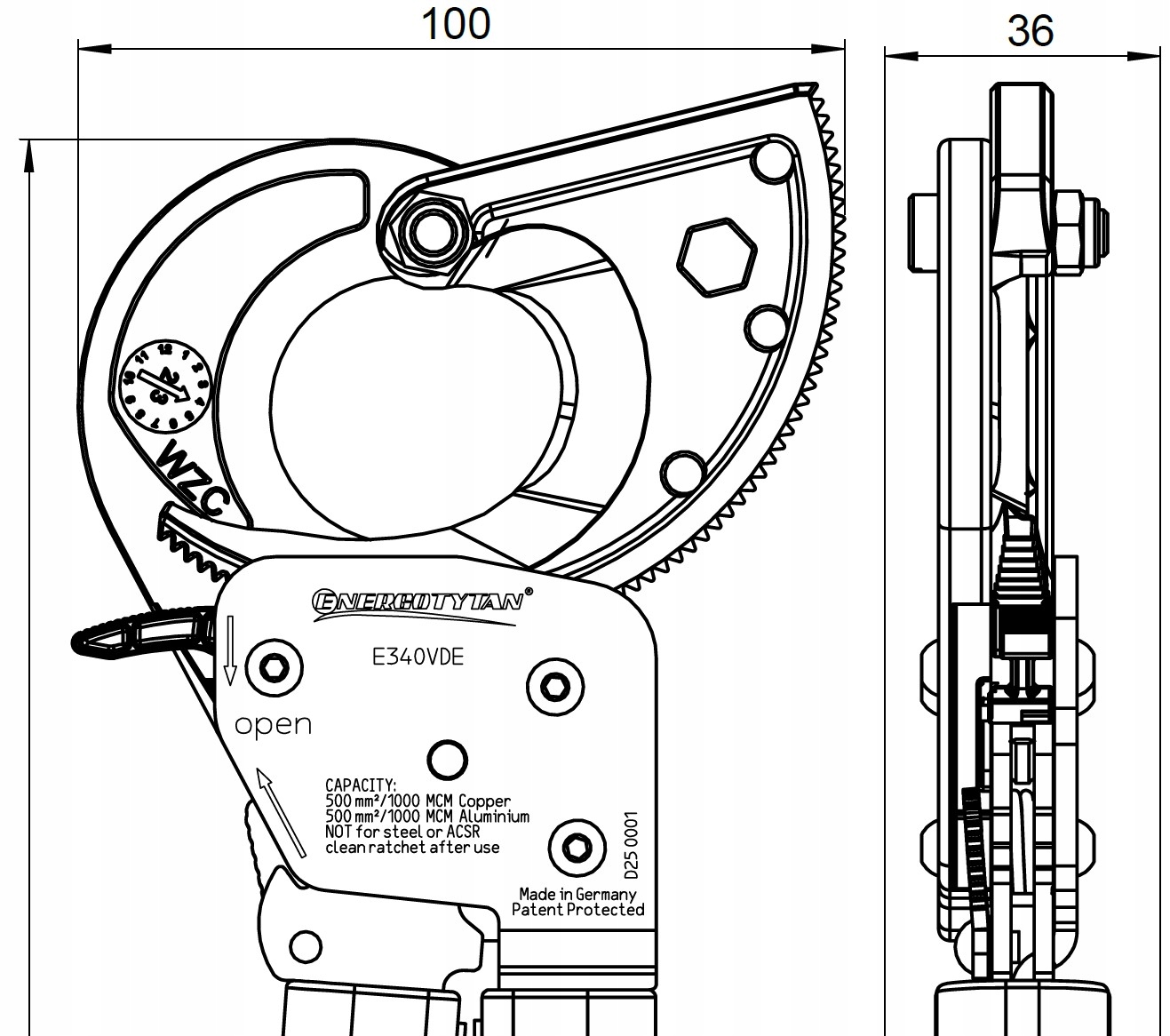 Для резки без складок медные кабели до 300 мм² (600 мкм) и алюминиевые кабели до 380 мм² (750 мкм) диаметром до 34 мм. Для работы в области компонентов напряжения до 1000 В переменного тока.