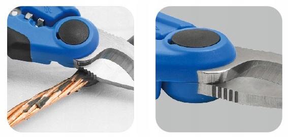 Профессиональные ножницы со специальной стальной рамой, обладающей высокой механической прочностью и высокой прочностью. Ножницы для резки кабелей и электрических проводов. Зубчатое лезвие изготовлено из нержавеющей стали 4034, что обеспечивает чистый срез. Дополнительным преимуществом ножниц является специальная выемка, которая позволяет снимать изоляцию и предотвращает соскальзывание кабеля при резке. Ручка изготовлена из легкого и прочного ударопрочного пластика PP+TPR. Эргономичные ручки обеспечивают удобный захват, что повышает эффективность работы. Ножницы оснащены пластиковым чехлом, защищающим лезвие, и клипсой, позволяющей прикрепить ножницы к ремню.