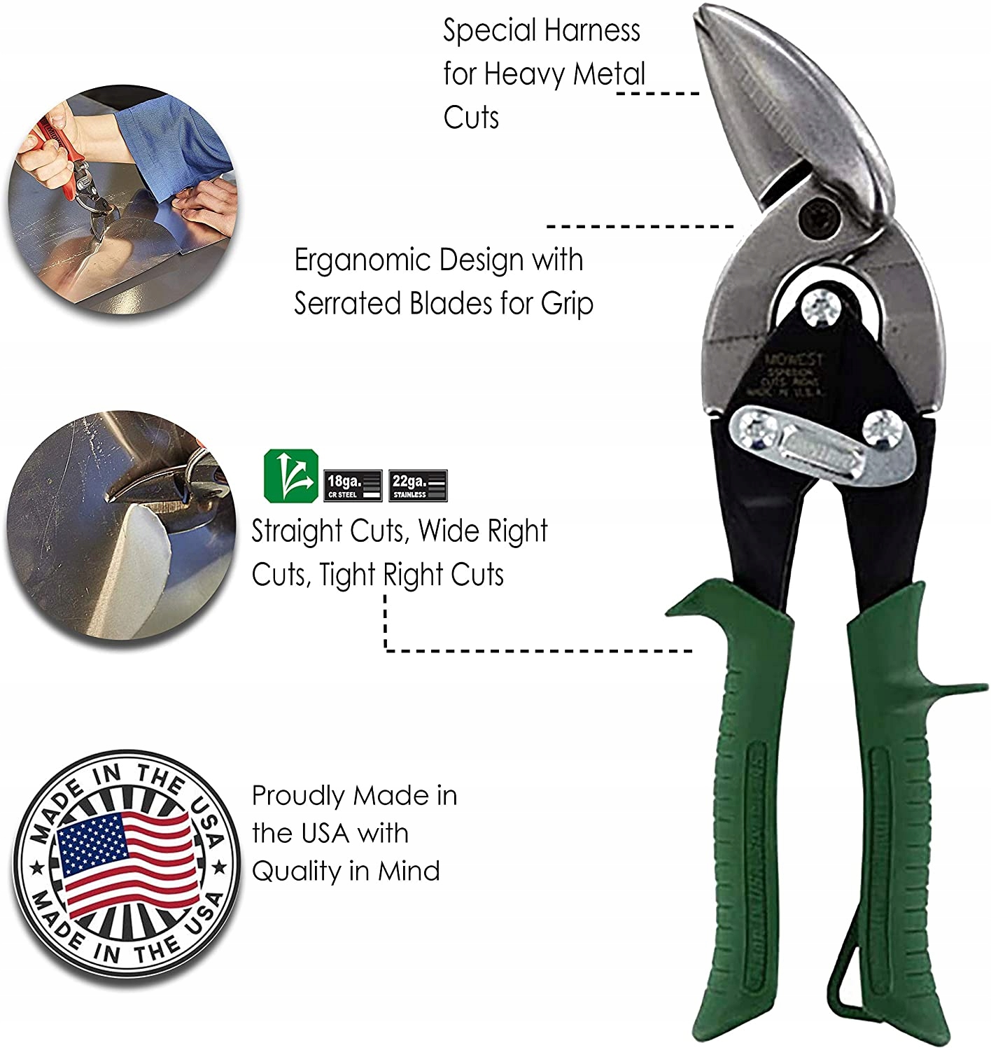Конструкция ножниц со смещением Midwest® позволяет расположить руку над разрезаемым материалом в идеальном положении, обеспечивая плавность и безопасную маневренность при выполнении длинных разрезов или крутых дуг.