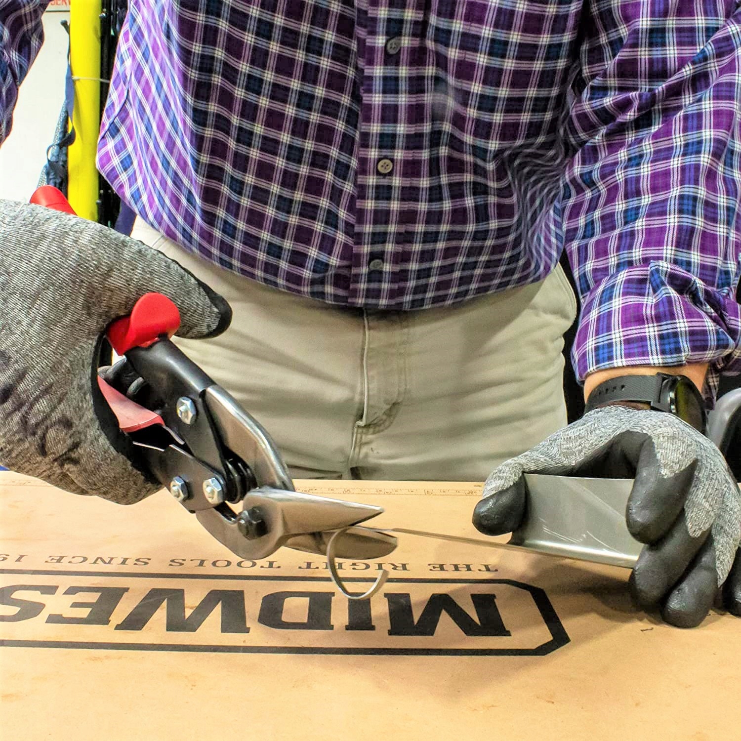 Конструкция ножниц со смещением Midwest® позволяет расположить руку над разрезаемым материалом в идеальном положении, обеспечивая плавность и безопасную маневренность при выполнении длинных разрезов или крутых дуг.