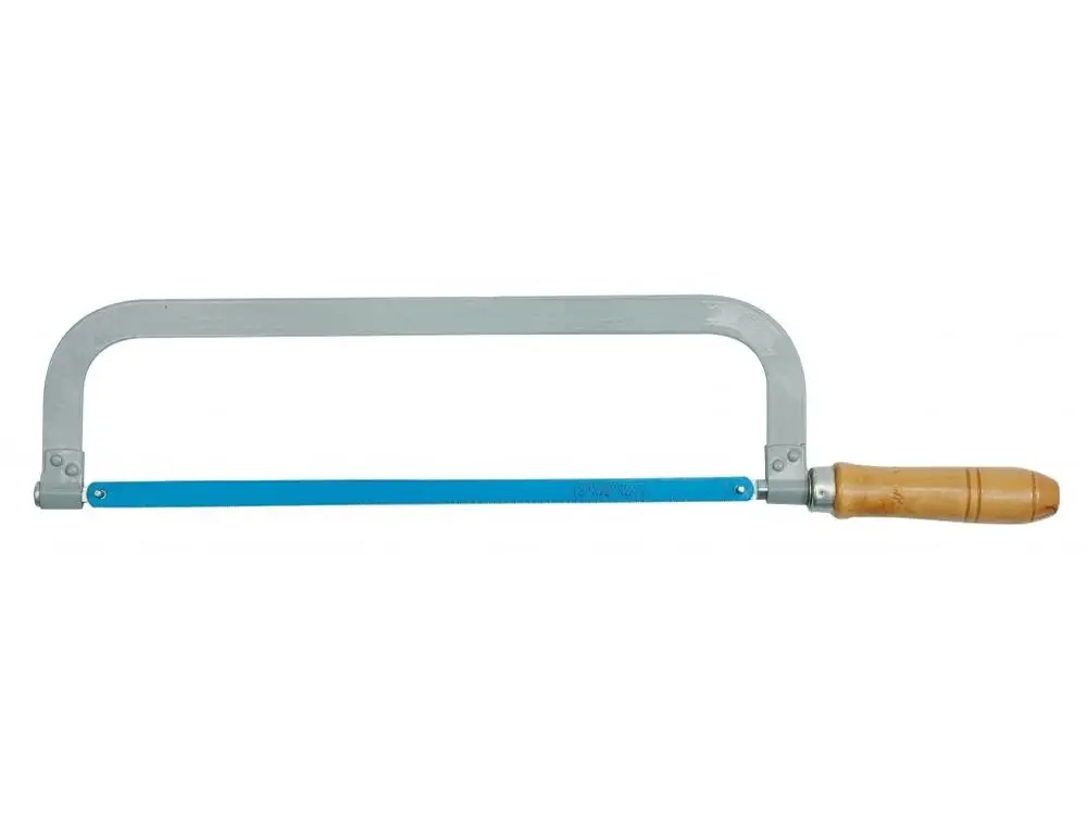 Типичная рама для крепления пильных полотен длиной 300 мм. Изготовлен из плоской стали, с натяжным винтом и деревянной ручкой. Конструкция рукоятки позволяет крепить пильное полотно под углом 45°.