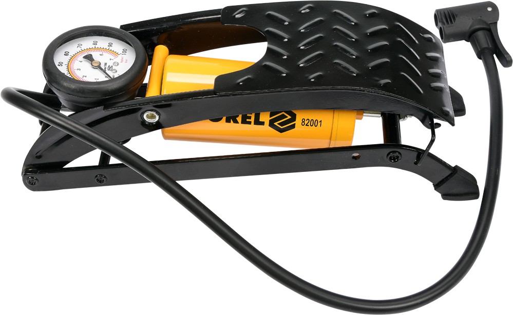 Однопоршневой ножной насос с манометром. Изготовлен из металлического гибкого шланга с универсальным наконечником, позволяющим надувать клапаны как автомобиля, так и велосипеда. Манометр градуирован до 7 БАР. В комплект также входят универсальные насадки для надувания мячей, матрасов и т.п.