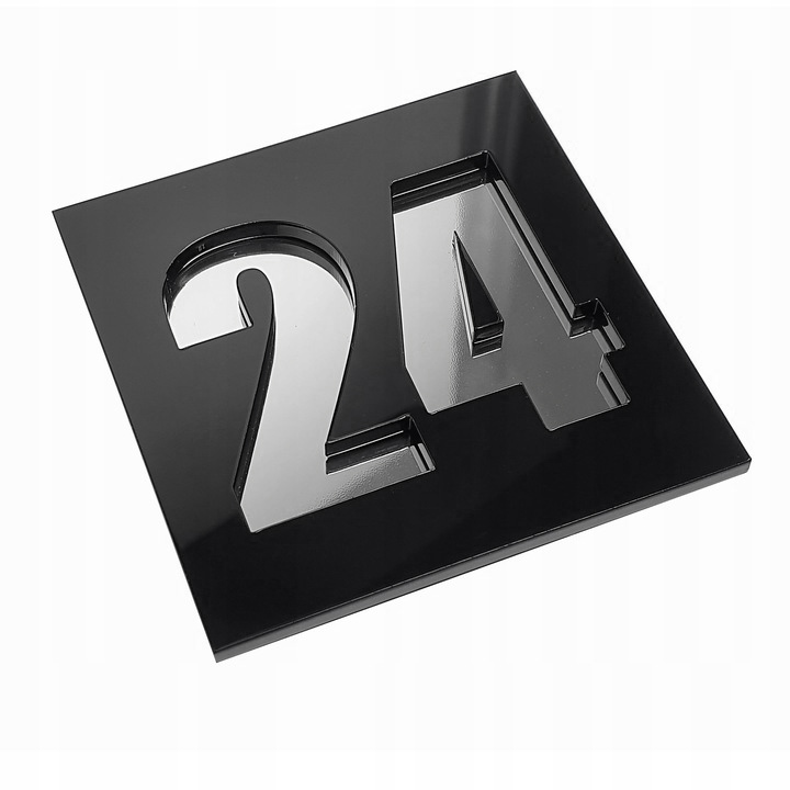 Изделие выполнено из черного оргстекла толщиной 3 мм и зеркального ламината, заполняющего фон из букв или цифр.