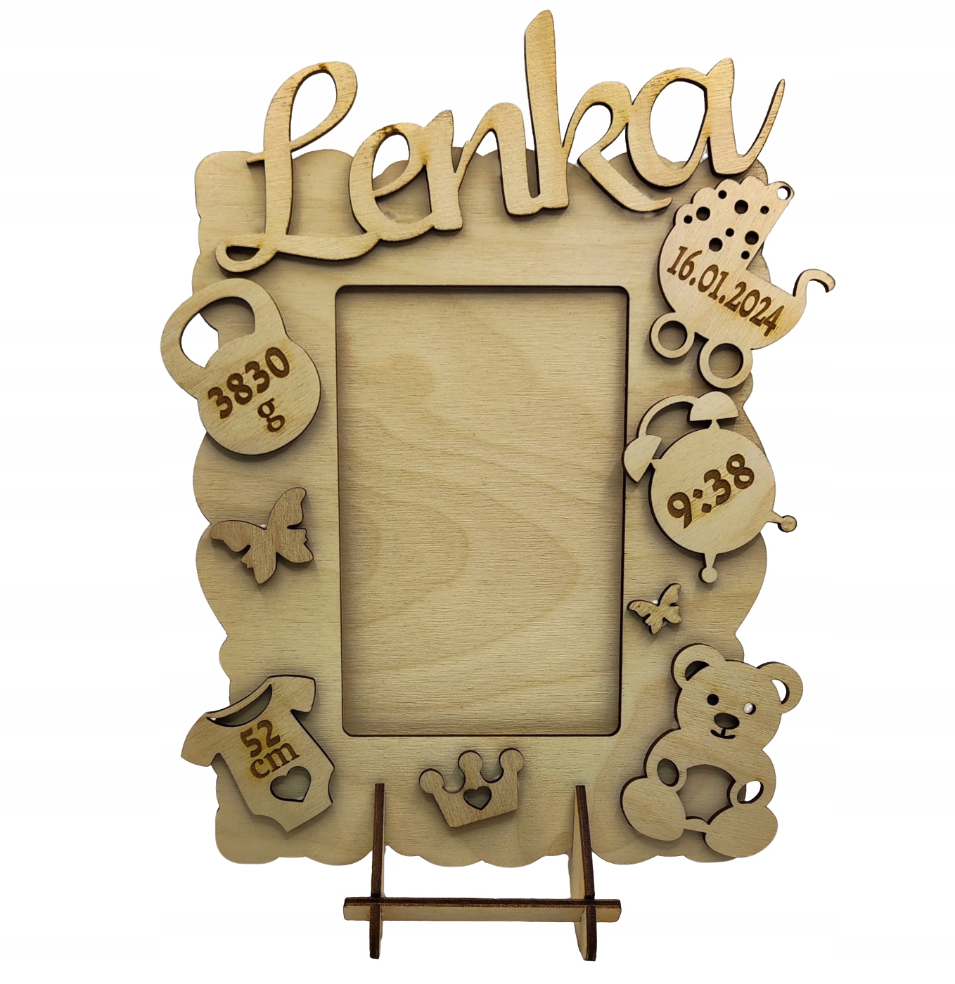 Эта красивая рамка изготовлена из высококачественной березовой фанеры и вместит в себя всю самую важную информацию о вашем малыше: