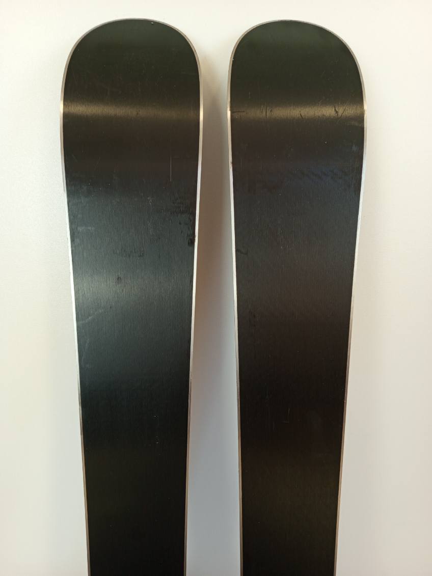 Следы нормального использования - вмятины и мелкие потертости и царапины на графическом оформлении лыж и креплений.