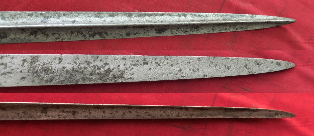 Штык виден на прикрепленных фотографиях. Штык равномерно покрыт мелкой зернистостью и не имеет механических повреждений. Кольцо отсутствует. Общая длина штыка 51,6 см, длина гильзы 9,2 см, внутренний диаметр гильзы 22,6/23,4 мм, ширина клинка 27,7 мм, толщина клинка 11,8 мм. На лезвии видна подпись.