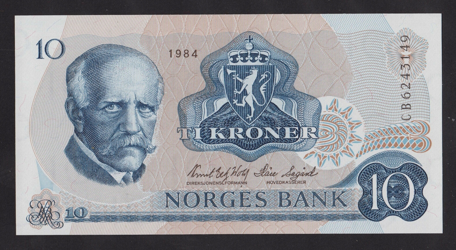 Красивая банкнота достоинством 10 крон Норвегии 1984 года. (P-36c) в абсолютно идеальном банковском состоянии I (UNC).
