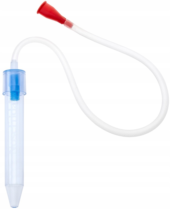 Чтобы предотвратить попадание выделений или бактерий в трубку, следует прикрепить одноразовый фильтр. Приложите кончик трубки к ноздре ребенка так, чтобы он плотно прилегал (не вставляйте его внутрь). Вдохните через красный мундштук, соблюдая осторожность.