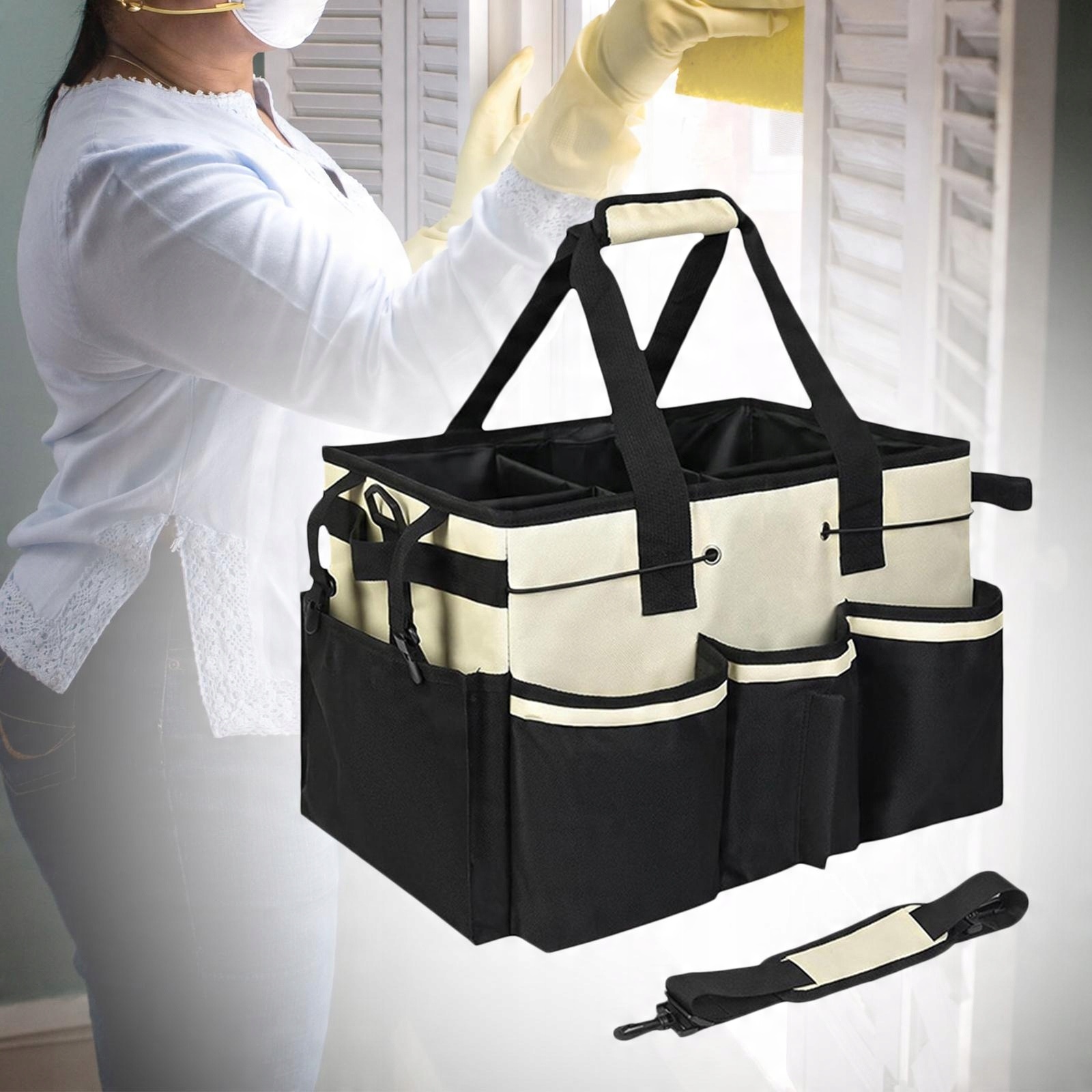 [Широкое применение]: сумка для чистящих средств не только подходит для домохозяек, уборщиков, но также может использоваться в качестве места для хранения автомойки, садовых инструментов, малярных инструментов и предметов под раковиной.