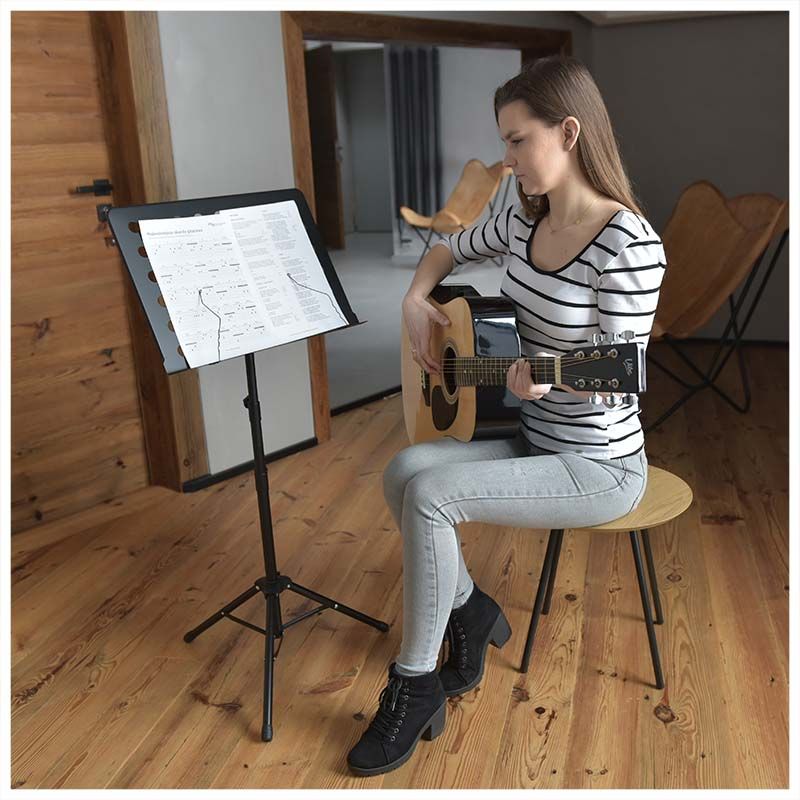 Специальные пружинящие стержни прижимают текстовый материал или партитуры, с которыми мы работаем, на рабочий стол. Благодаря этому содержимое не упадет даже при случайном ударе, а ветер не унесет его на открытые площадки. Угол наклона стола по отношению к пользователю регулируется, а его глубина позволяет разместить на нем даже толстую папку, что делает его идеальной подставкой для текстов песен для свадебного оркестра или солиста.