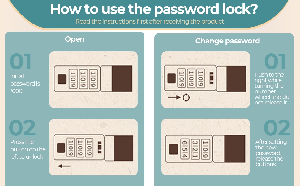 3. Когда блокировка открыта, нажмите кнопку вправо, а затем переместите номера, чтобы установить новый пароль.