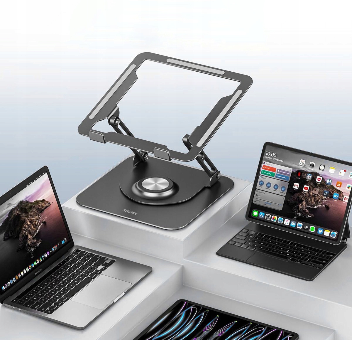 База ноутбука Sununix - эргономичная, складная и многофункциональная подставка для ноутбука SunUnix - это современное решение, созданное для удобной и здоровой работы - как дома, так и в путешествиях. Благодаря компактному дизайну, возможностям корректировки и твердым материалам, он обеспечивает стабильность, эргономику и надежность каждый день.