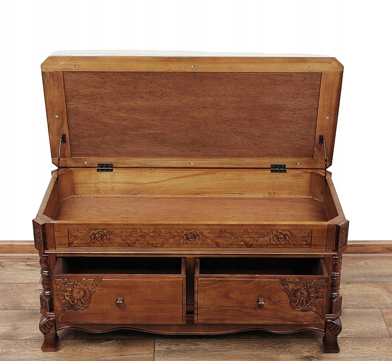 Очаровательный деревянный предмет мебели с красивой резьбой. Имеет два выдвижных ящика и практичный отсек для хранения. Обивка покрыта защитной пленкой.