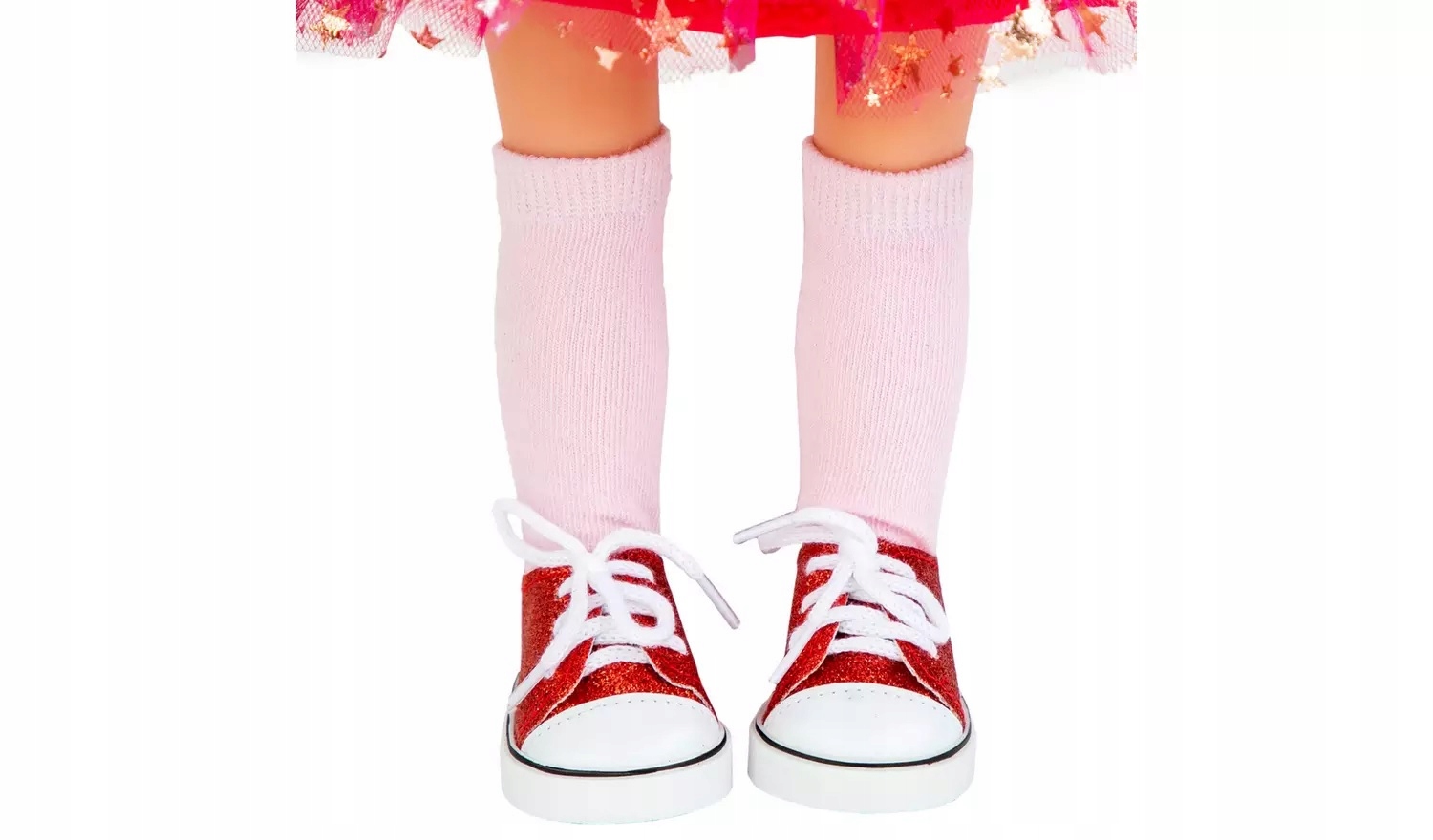 Ее рост 18 дюймов / 46 см, она носит розовую толстовку с длинными рукавами с напечатанной на ней графикой Робина и красную пачку. со звездами из розового золота, розовыми носками до колен и красными блестящими спортивными туфлями.
