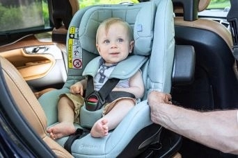 Функция частичного поворота основания поддерживает положение RWF (против хода движения), что повышает безопасность ребенка во время путешествия.