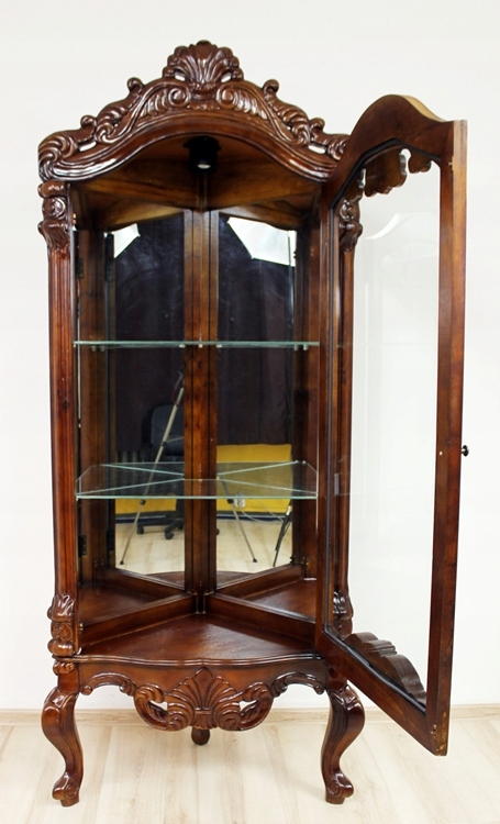 Очаровательный предмет мебели с красивой резьбой. Интерьер разделен на три части стеклянными полками, что позволяет хранить за стеклом домашний фарфор или превратить витрину в барную стойку. Дополнительным преимуществом является установленное внутри освещение.