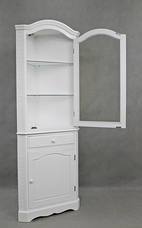 Очаровательный угловой предмет мебели со стеклянными полками, шкафчиком и ящиком. Вся вещь украшена красивой резьбой.