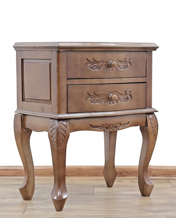 Очаровательный деревянный предмет мебели с двумя ящиками и красивой резьбой.