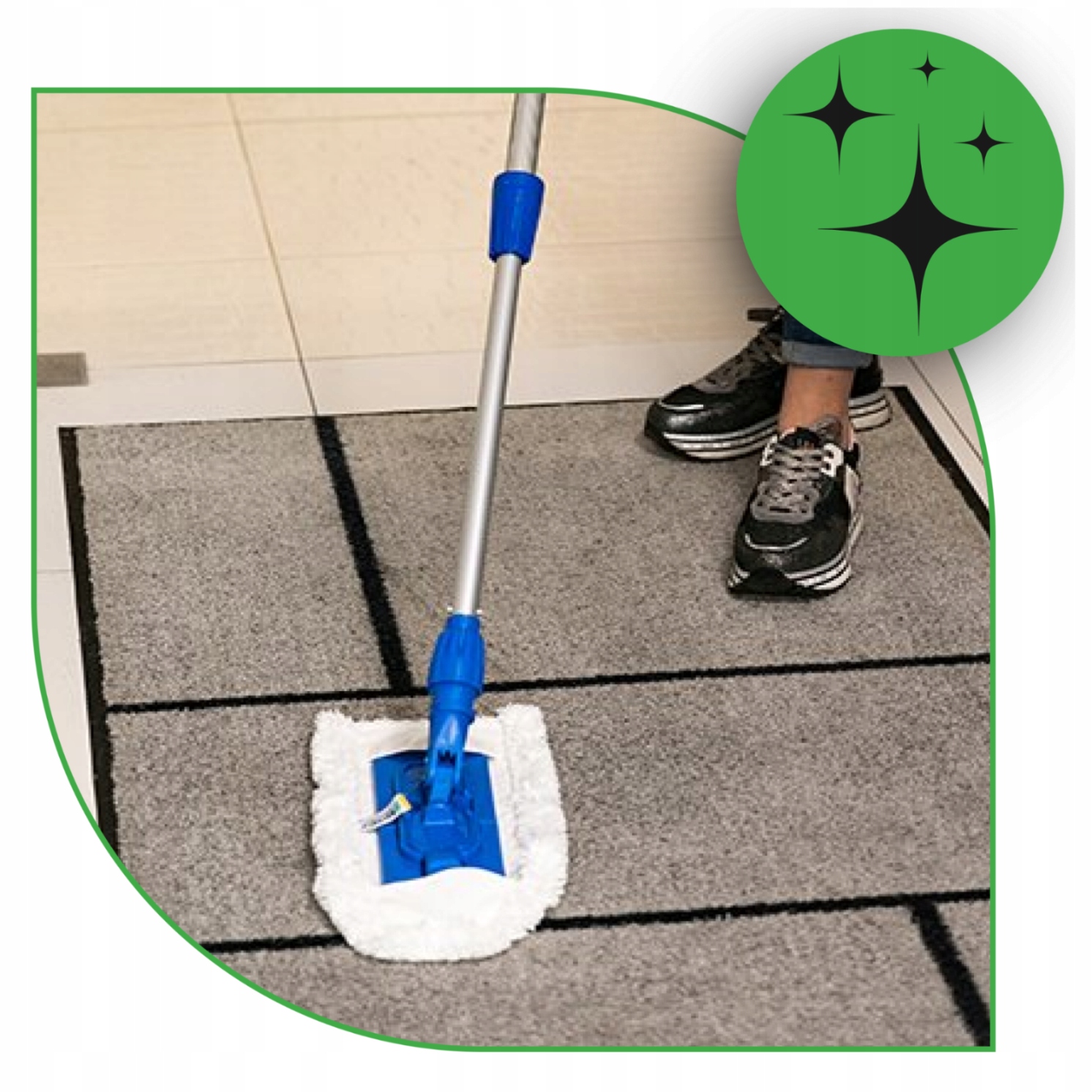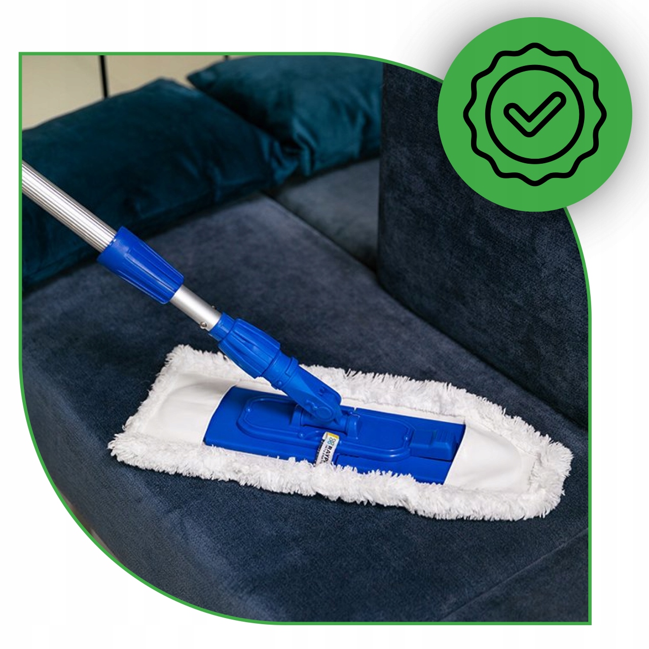 Намочите подушку водой и отожмите. Затем прикрепите его к промышленному держателю, прикрепленному к телескопической штанге. После использования его можно стирать вручную в воде с антибактериальным мылом NanoSilver или в стиральной машине при температуре до 60°C (без смягчителей). Избегайте интенсивной сушки, например. в сушилках или на радиаторах.