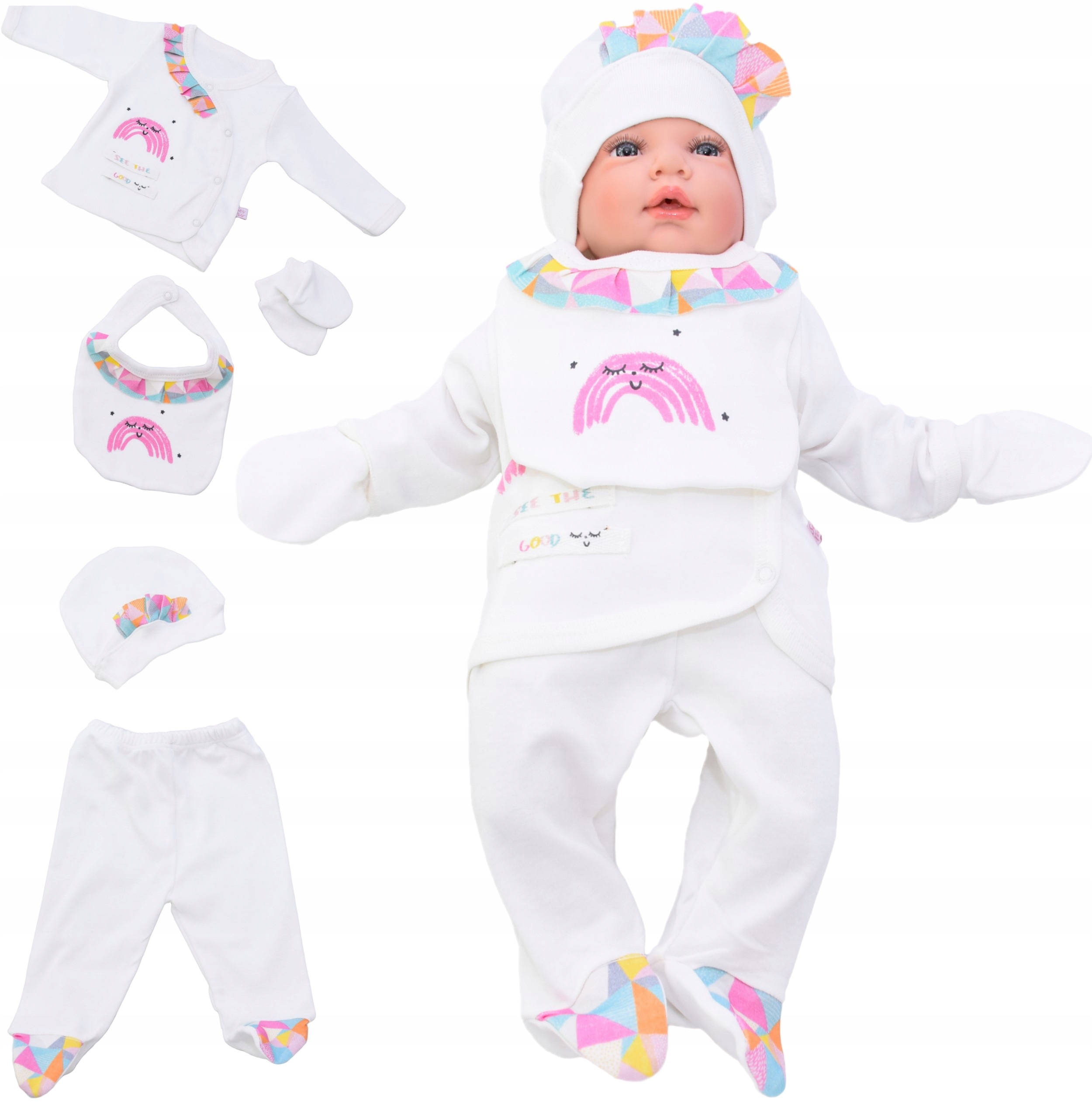 Белый комплект из 5 предметов для девочки. Комплект состоит из футболки с длинными рукавами, комбинезона, шапочки, перчаток-когтей и нагрудника. Этот набор представляет собой готовую больничную простыню или отличный подарок новорожденному. Также подойдет в качестве подарка на детский праздник.