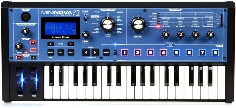 Novation MiniNova — компактный полифонический синтезатор, предназначенный как для сценического, так и для студийного использования. Механизм синтеза, эффекты и фильтры взяты из более крупного синтезатора Novation UltraNova. На борту 256 потрясающих цветов, не только с быстрым доступом к изменению патчей, но и сгруппированных по стилю и порядку. Более того, выбранный звук можно модулировать с помощью 4 ручек, ручки фильтра и восьми программируемых кнопок «анимации». Поэтому синтезатор предлагает большие возможности для создания звука в реальном времени. Novation Mininova — 18-голосный инструмент, оснащенный 37-клавишной мини-клавиатурой.