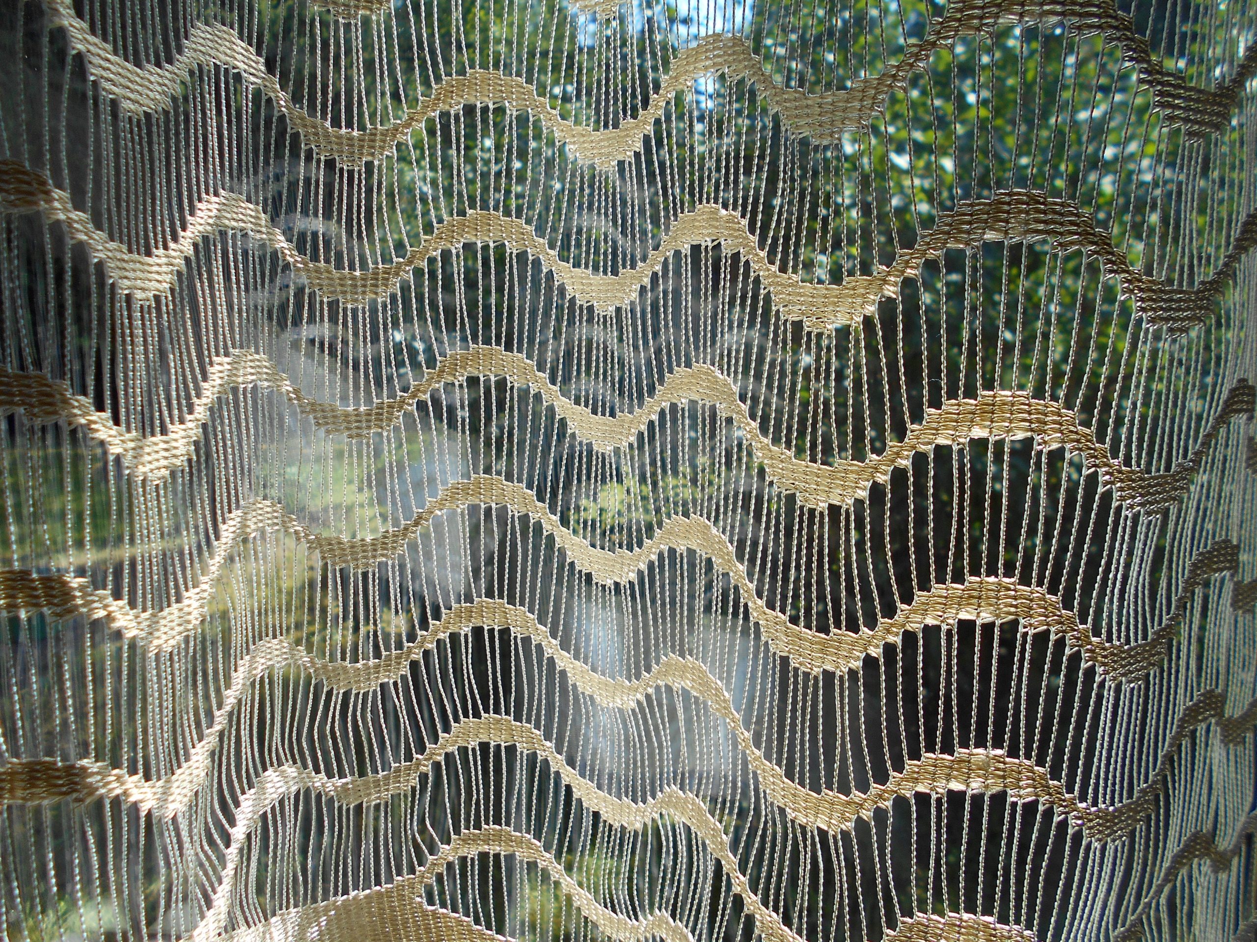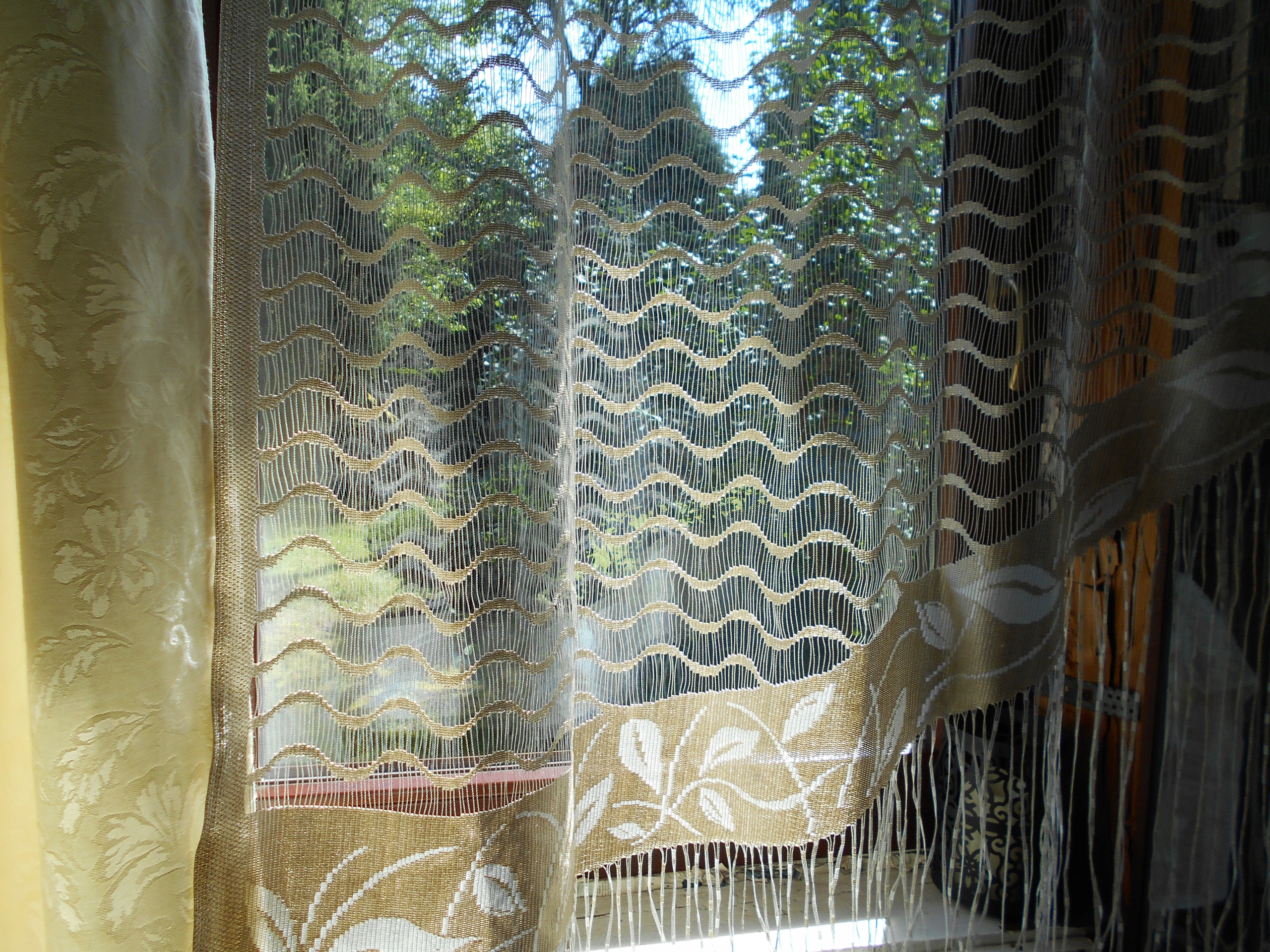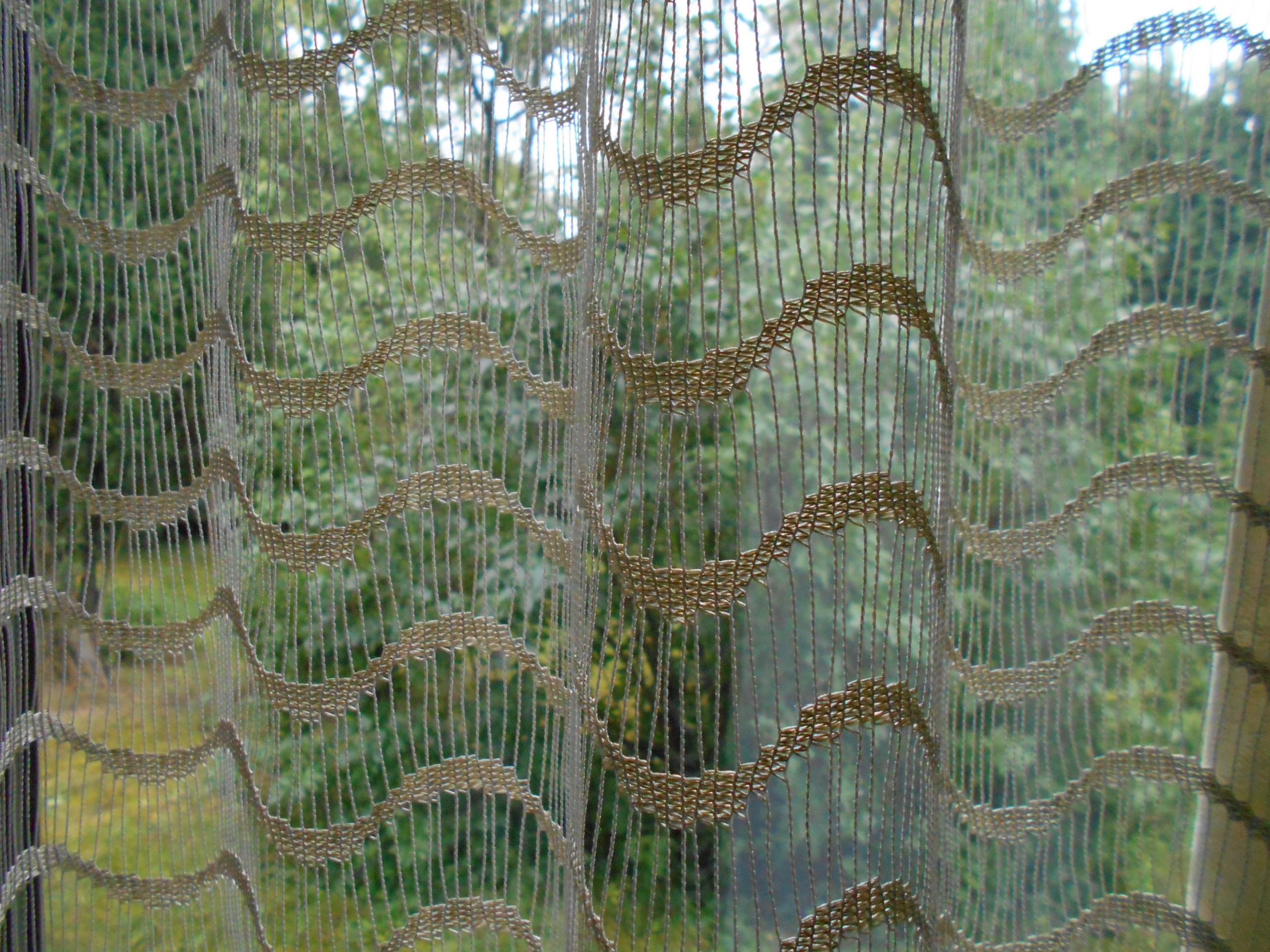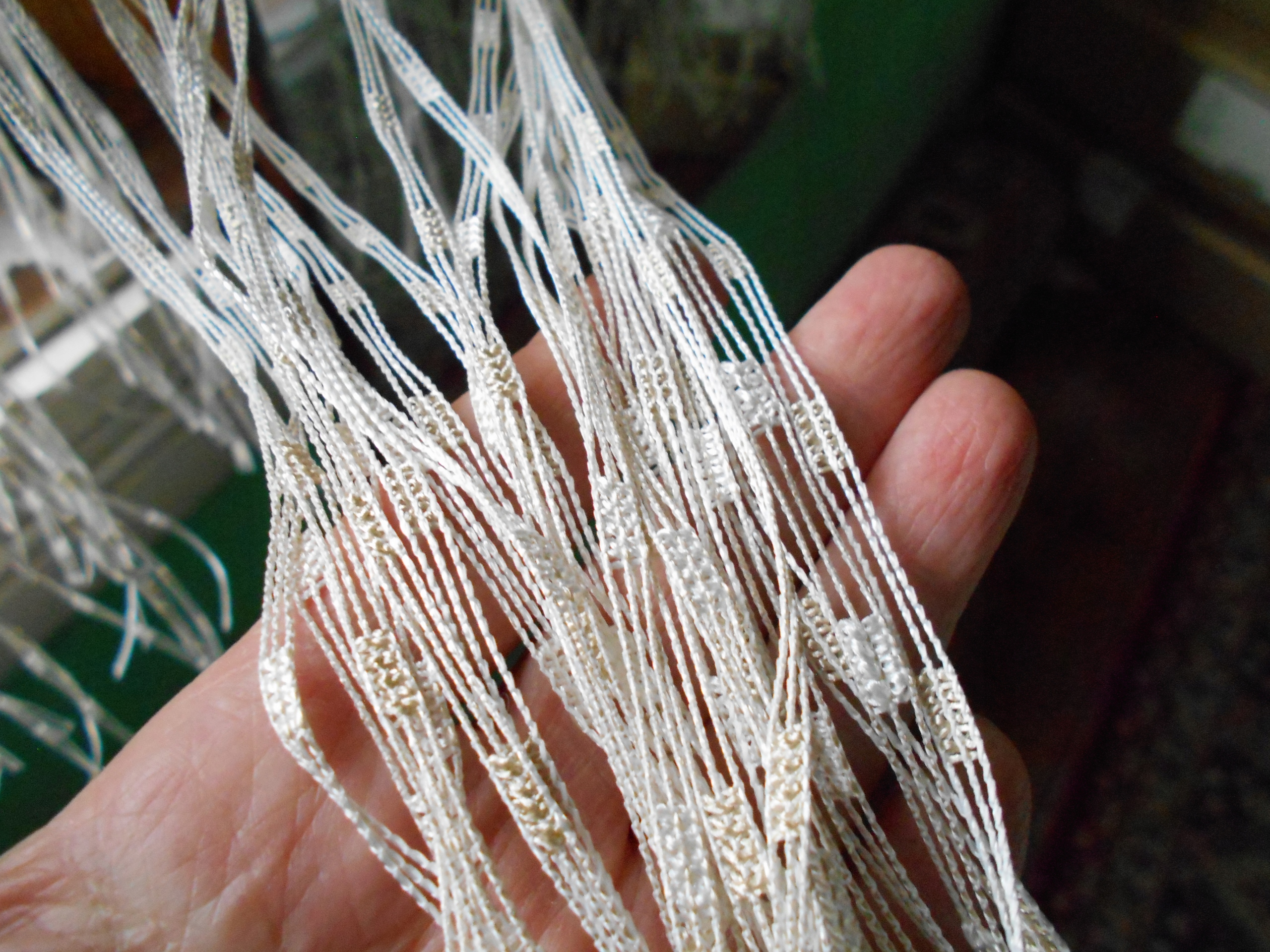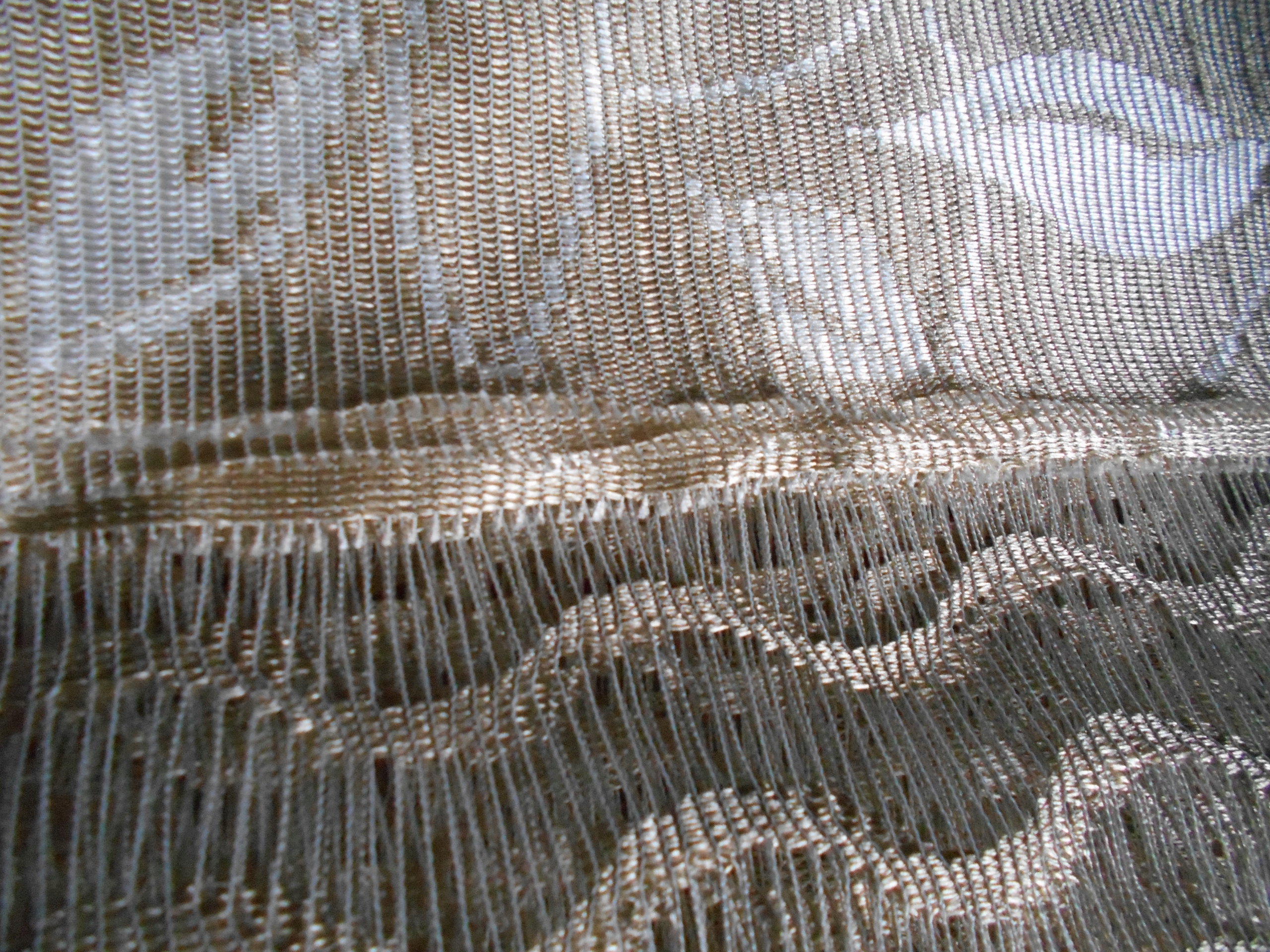 Прекрасная новая занавеска. Очень оригинально, неповторимо. Очень ажурный. Завершается декоративным жаккардовым бондажным поясом, вырезанным в форме дуги, с белым растительным орнаментом. В верхней части такая же полоска, бока тоже обработаны на заводе, сшивать их не нужно. Однако край верхней части шторы лучше подогнуть наметочными стежками для ее укрепления, а лучше зашить тесьмой. Переливающаяся ткань чудесно переливается в зависимости от освещения. Весь низ занавески заканчивается длинными декоративными жемчужными лентами. Все это выглядит очень элегантно и изысканно. Подходит как к стильному, так и к современному интерьеру.