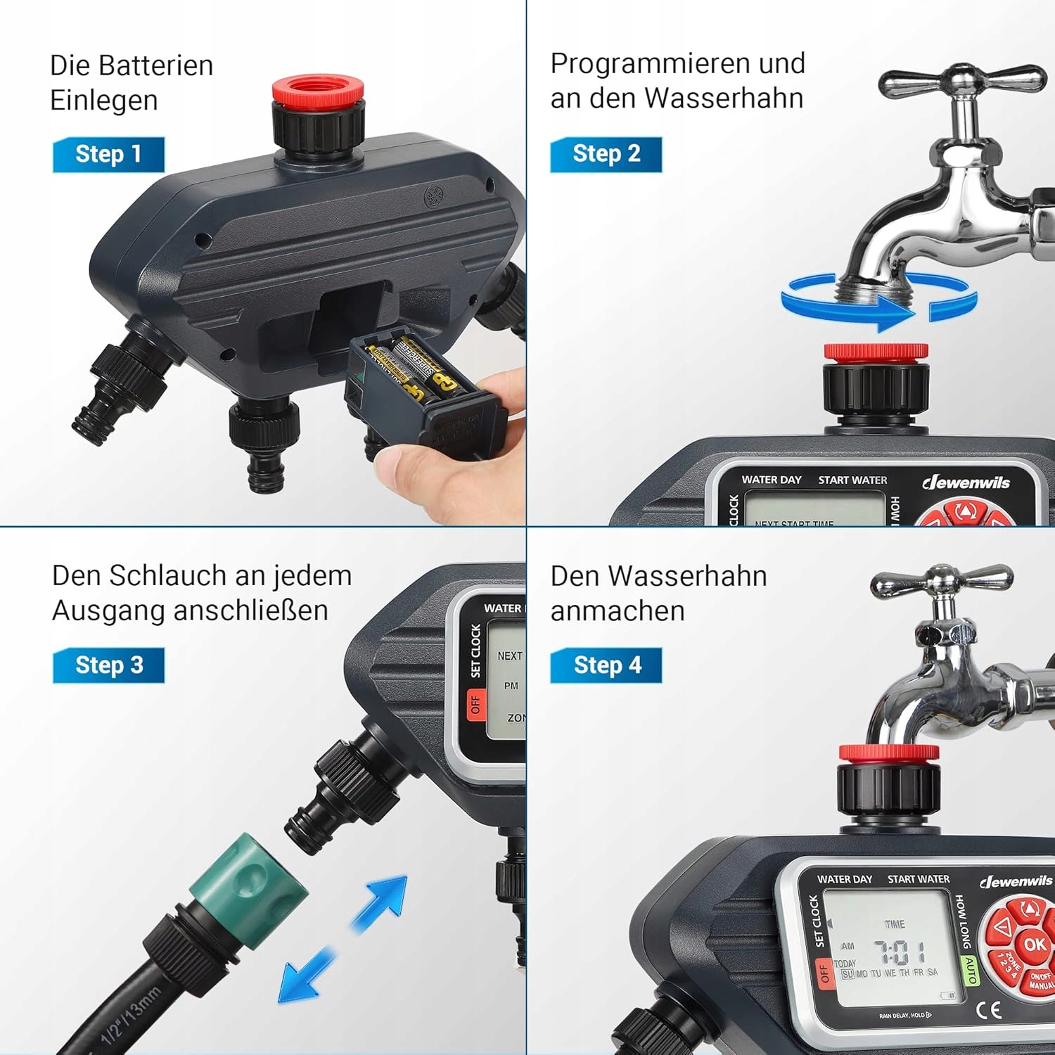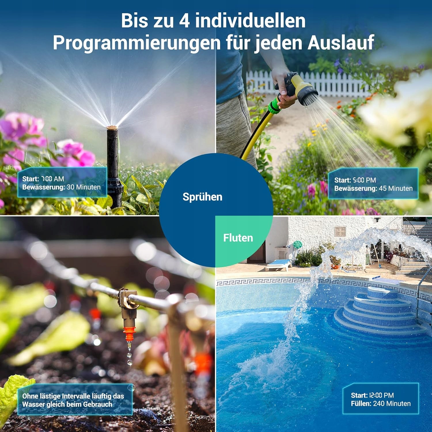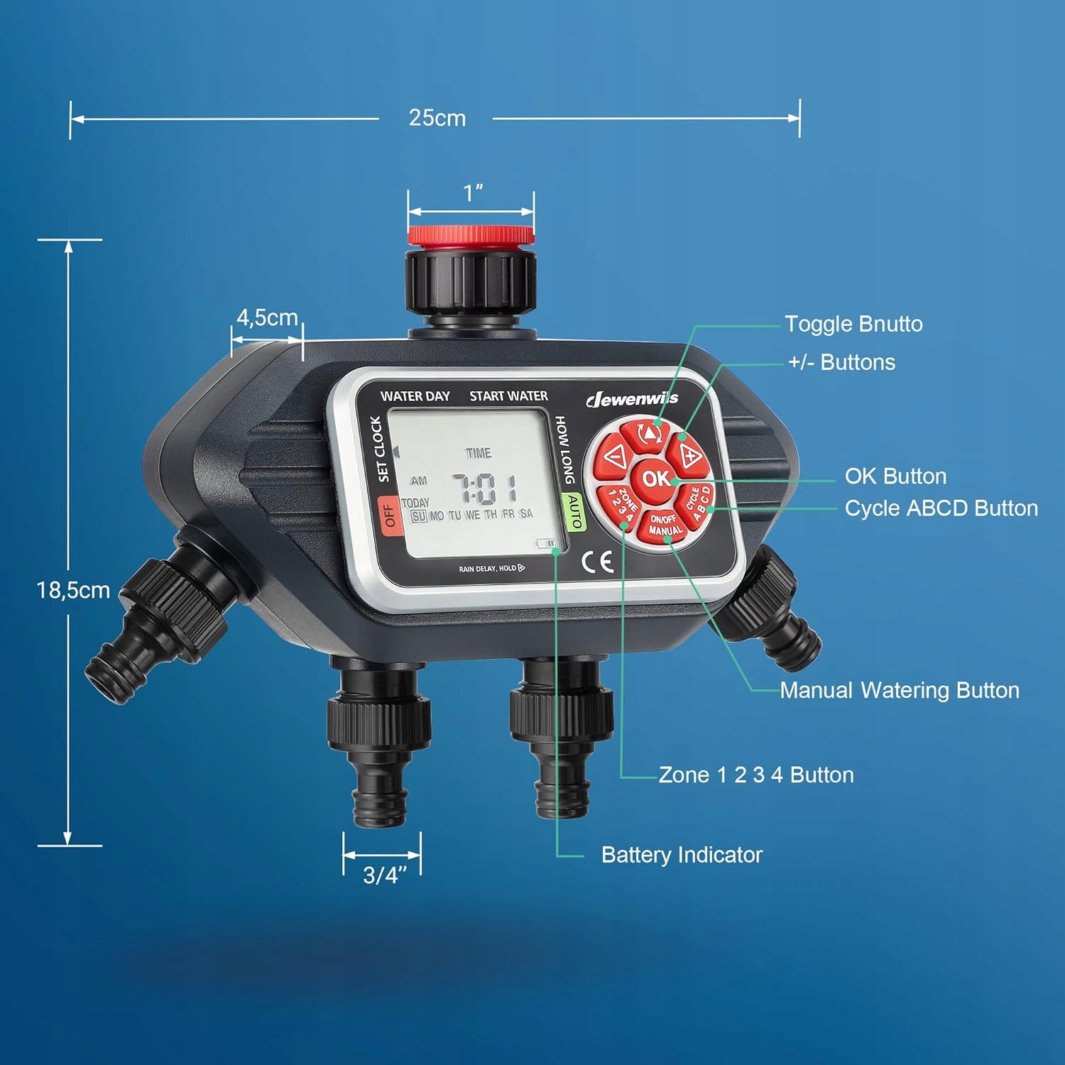 - Гибкое программирование】 4 Независимые розетки могут быть настроены на 4 цикла с помощью собственного начала -гибкая частота ирригации; Легкое ручное орошение с помощью кнопки «Рука»