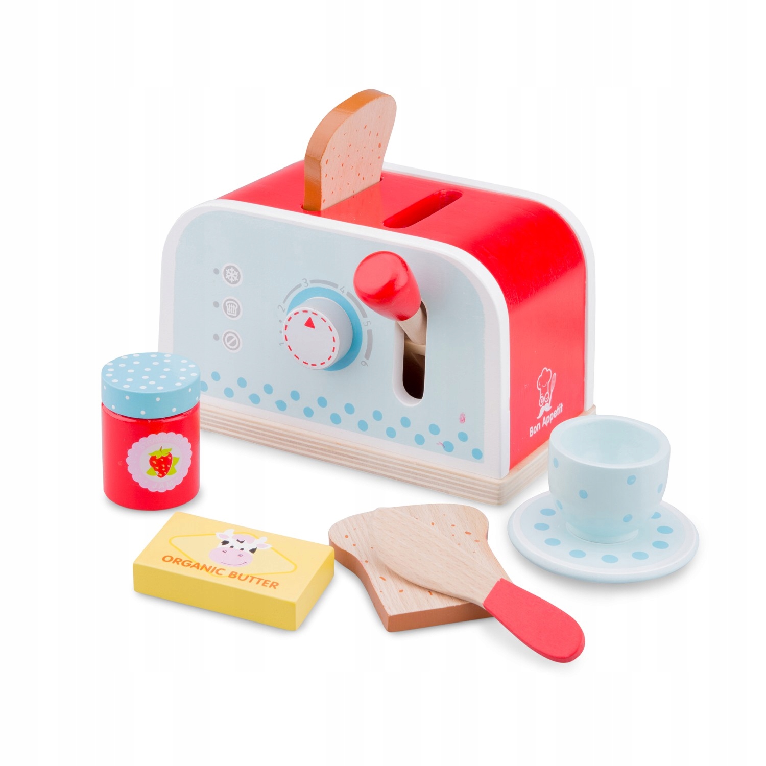 Красочный набор с тостером. Кто -то завтрак? Все, что вам нужно, чтобы сделать восхитительный тост. Сделать тосты легко! Поместите деревянные кусочки хлеба в тостер, поверните ручку, чтобы установить уровень выпечки и потянуть ручку вниз. Наконец, смажьте тост маслом и небольшим мармелад. Выпейте чашку хорошего чая или кофе для тоста. Вкусный!