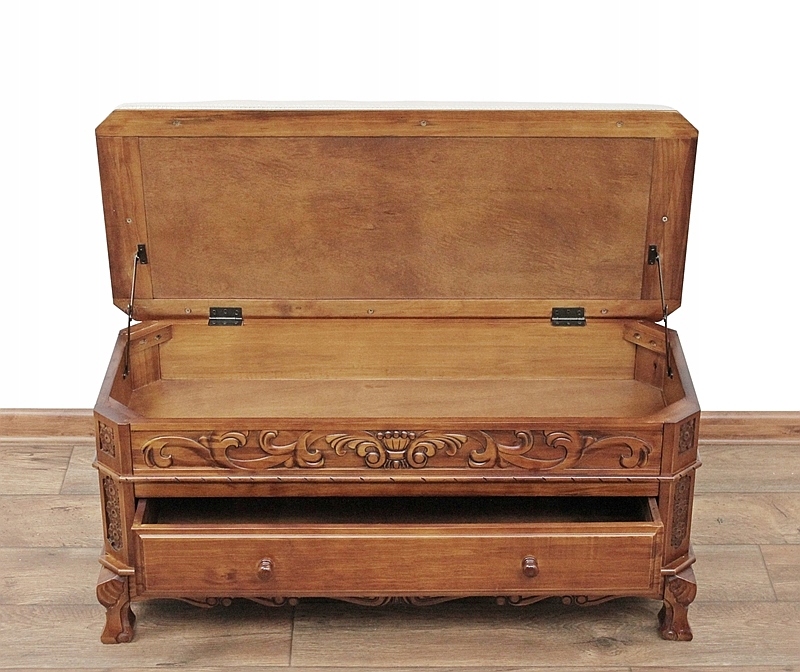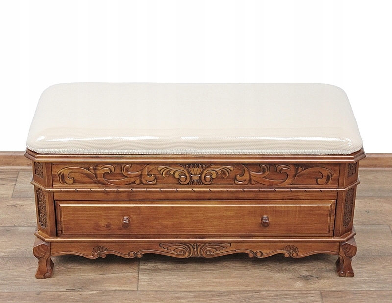 Очаровательный деревянный предмет мебели с красивой резьбой. Имеет выдвижной ящик и практичное отделение для хранения вещей. Обивка покрыта защитной пленкой.