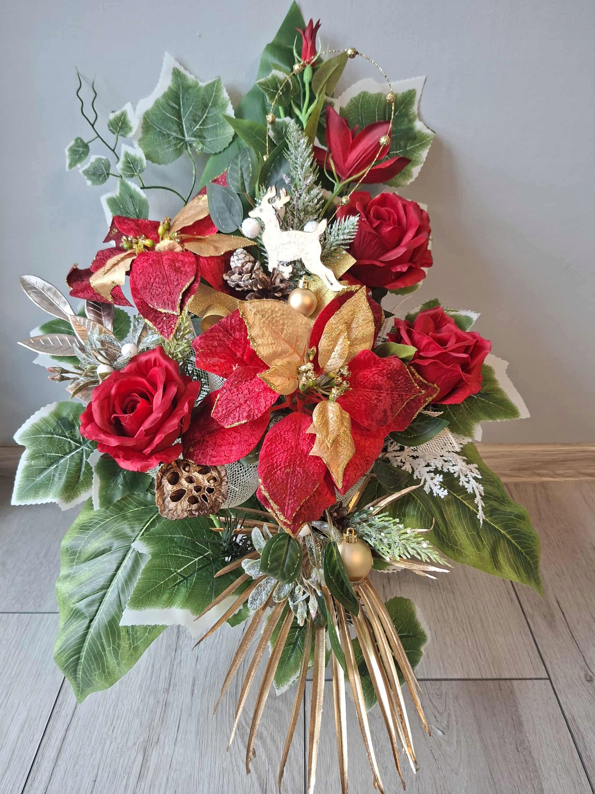 Для украшений характерна уникальная композиция из искусственных цветов. Тщательно подобранные цветы чрезвычайно реалистичны, добавляют букету аутентичности и подчеркивают его торжественный характер. Это изделие идеально подходит в качестве элемента украшения могилы, сочетая в себе уважение и элегантность в одном тщательно продуманном дизайне.