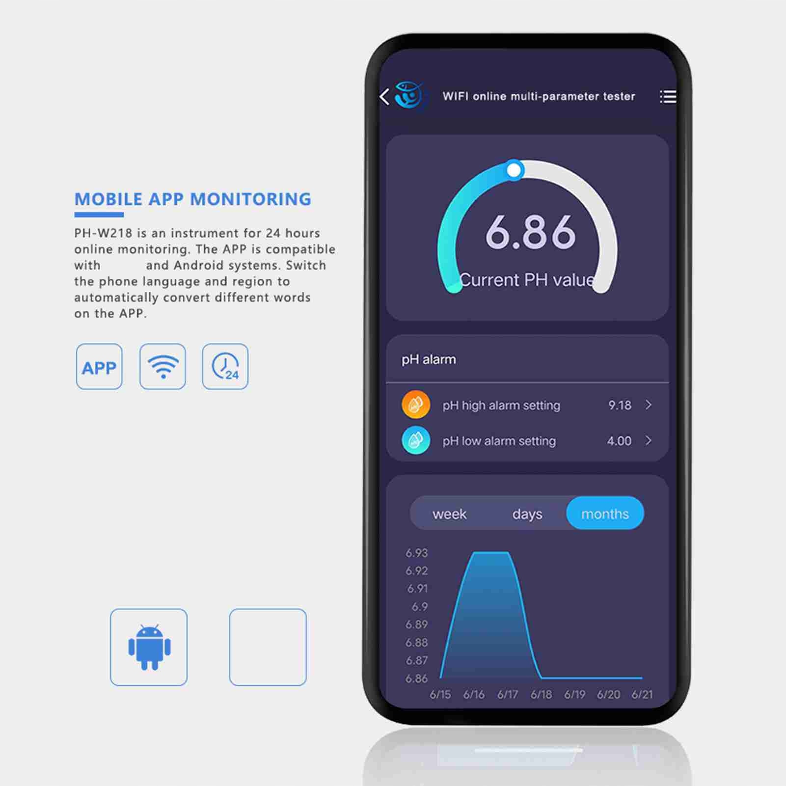 1. Анализатор качества воды в Интернете позволяет реальному мониторинге PH/EC/TDS/SALT/S.G/CF/ORP/температура через смартфон в приложении (бесплатно), совместим с системой iOS и Android, идеально подходит для 24 -часового онлайн -мониторинга.