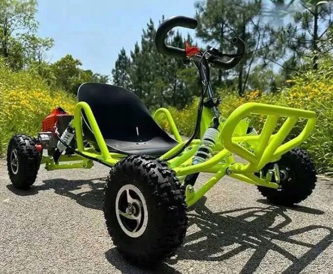 Я представляю внедорожный картинг внутреннего сгорания, предназначенный для экстремальных испытаний на различных поверхностях. Благодаря прочной конструкции, внедорожной подвеске и мощному двухтактному двигателю объемом 63,3 см³ этот картинг обеспечивает исключительные впечатления от вождения на любой местности.
