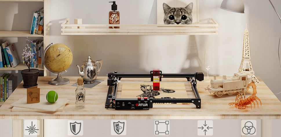 Новый дизайн защиты глаз: оснащен новым защитным кожухом для лазерного излучения. Лазерный гравировальный станок ORTUR может фильтровать 98% ультрафиолетового света, чтобы идеально защитить ваши глаза, снижая стоимость. очков и неудобство ношения очков.