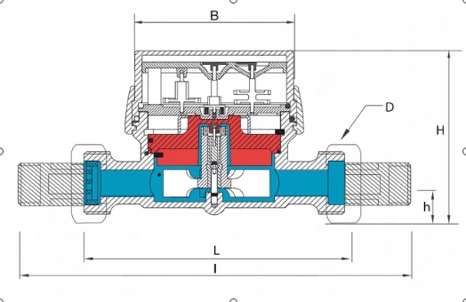 - Выходной патрубок корпуса водосчетчика приспособлен для опциональной установки обратного клапана.