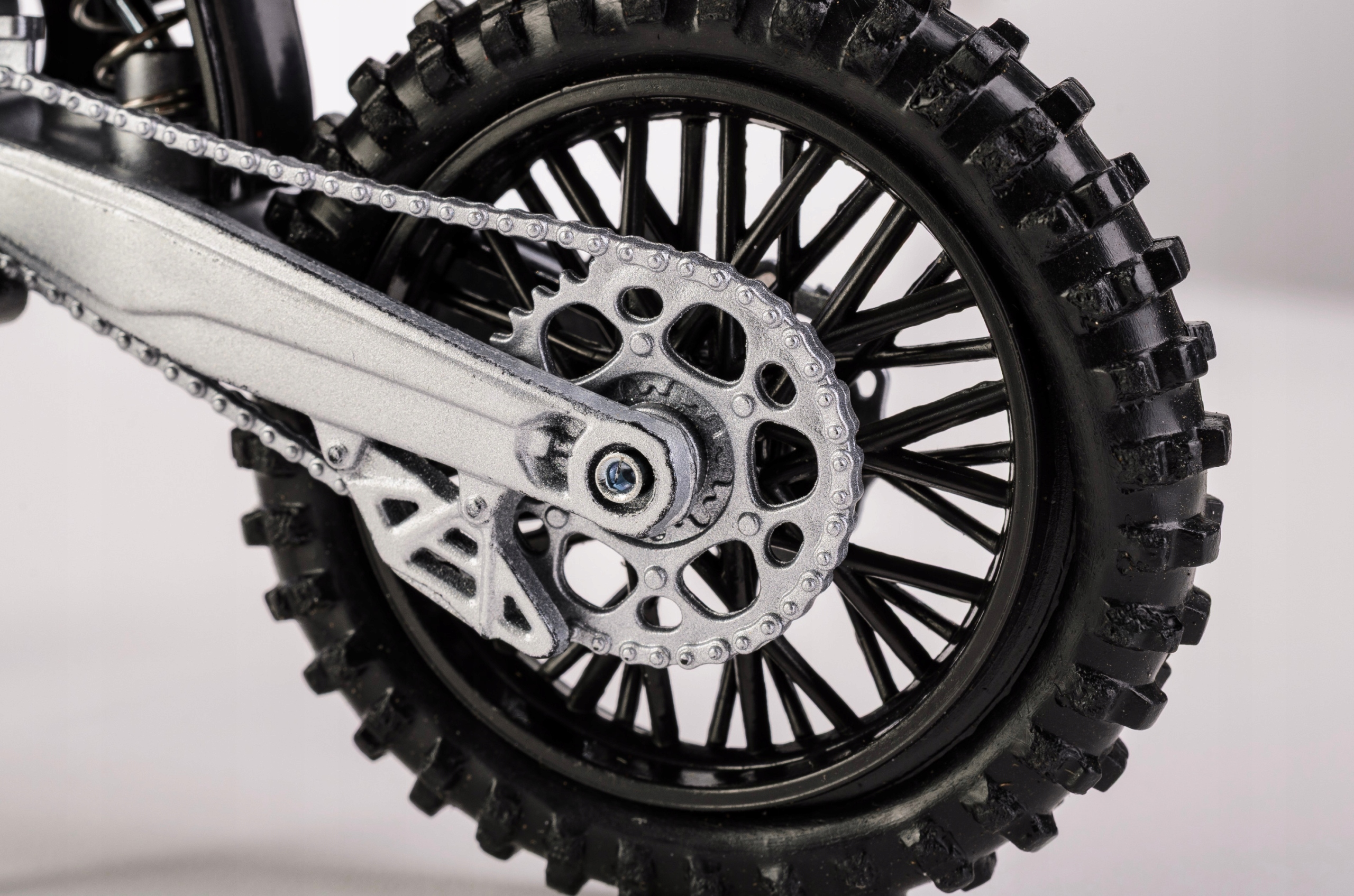 Мотоцикл в масштабе 1:12 с металлическим корпусом и пластиковыми деталями. Модель с подвижными колесами и поворотным рулем. В комплект входит подставка для демонстрации мотоцикла.