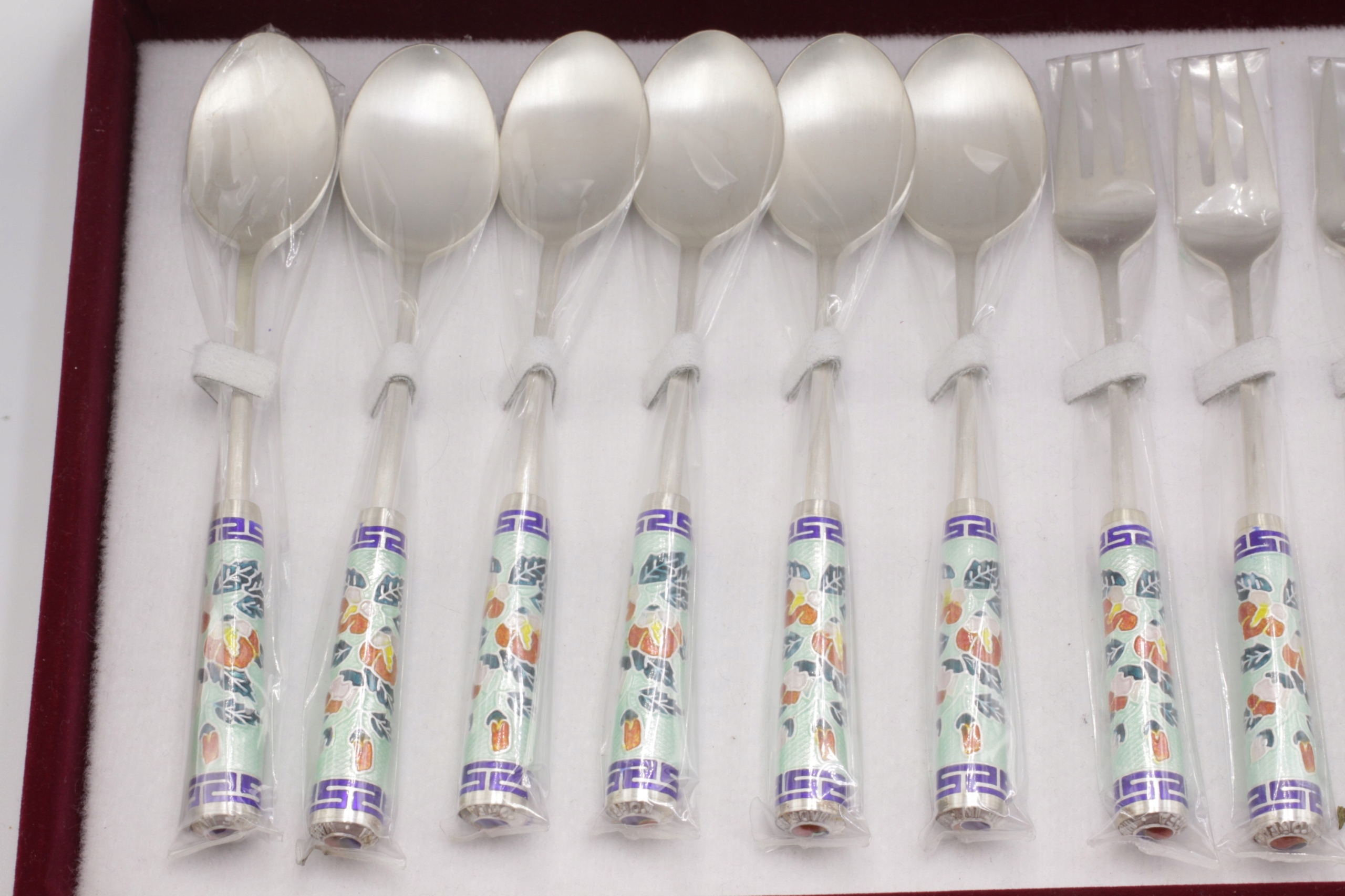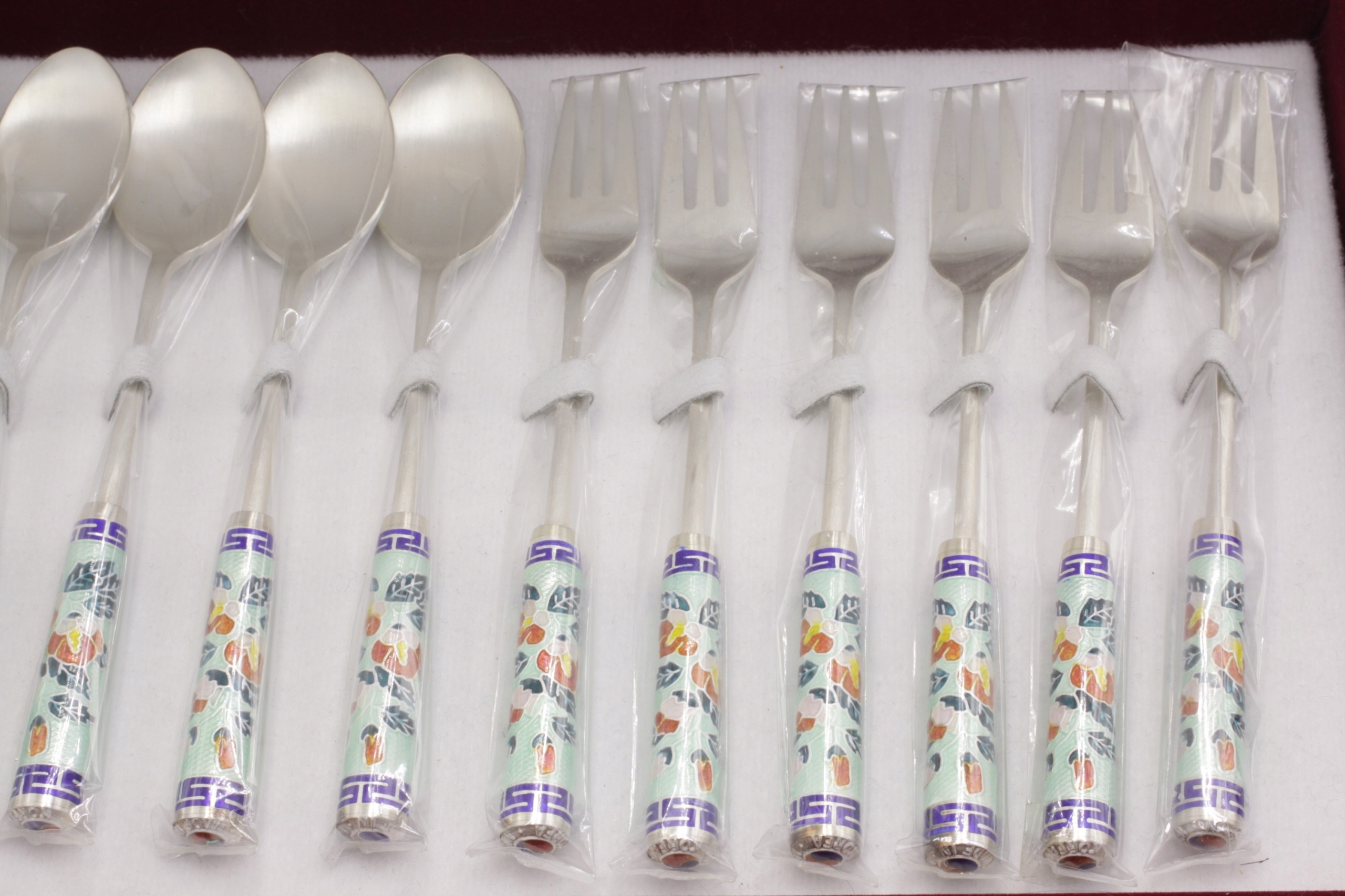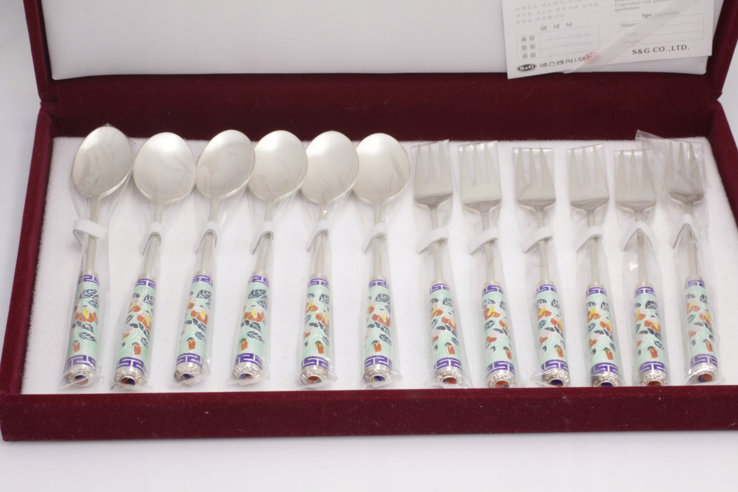 Набор из 6 чайных ложек и 6 вилок с эмалированными мотивами - новый, неиспользованный набор, в оригинальной упаковке.