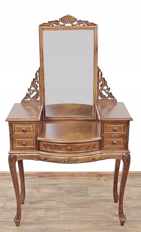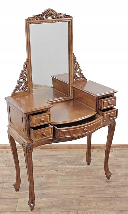 Очаровательный предмет мебели с гнутыми ножками и красивой резьбой. Имеет пять ящиков и впечатляющее большое зеркало.