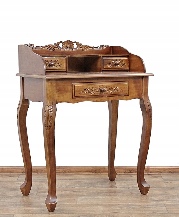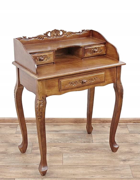 Очаровательный резной предмет мебели с тремя ящиками, полкой и практичной нишей. Все установлено на длинных гнутых ножках.