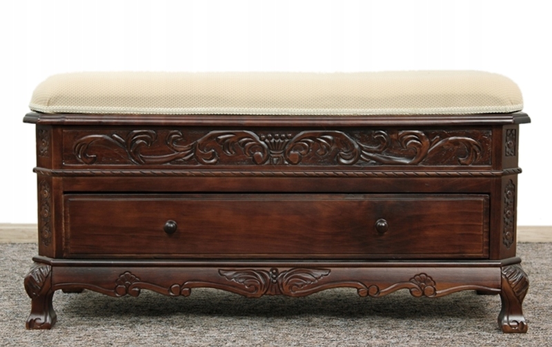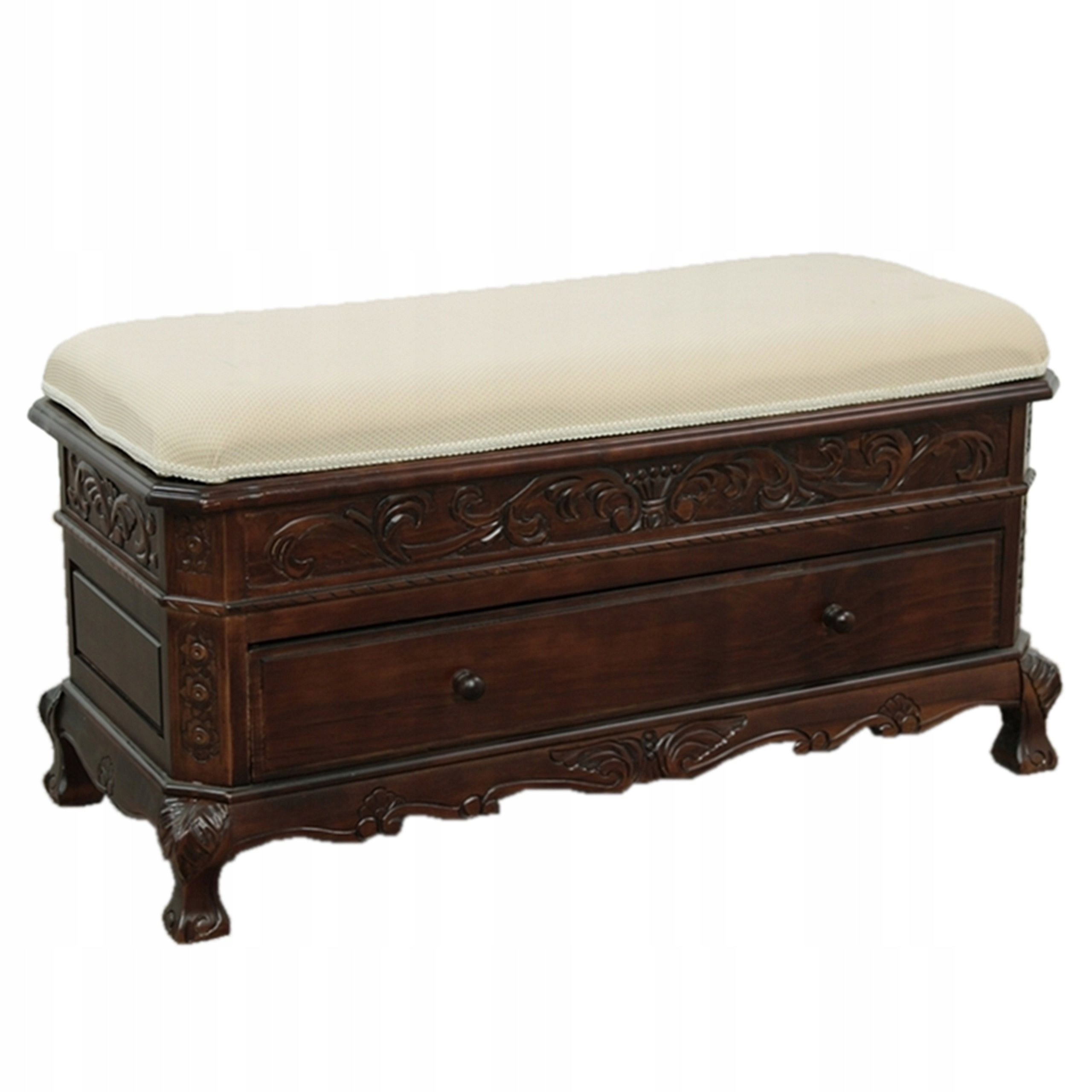 Очаровательный деревянный предмет мебели с красивой резьбой. Он имеет выдвижной ящик и практичное отделение для хранения. Обивка покрыта защитной пленкой.