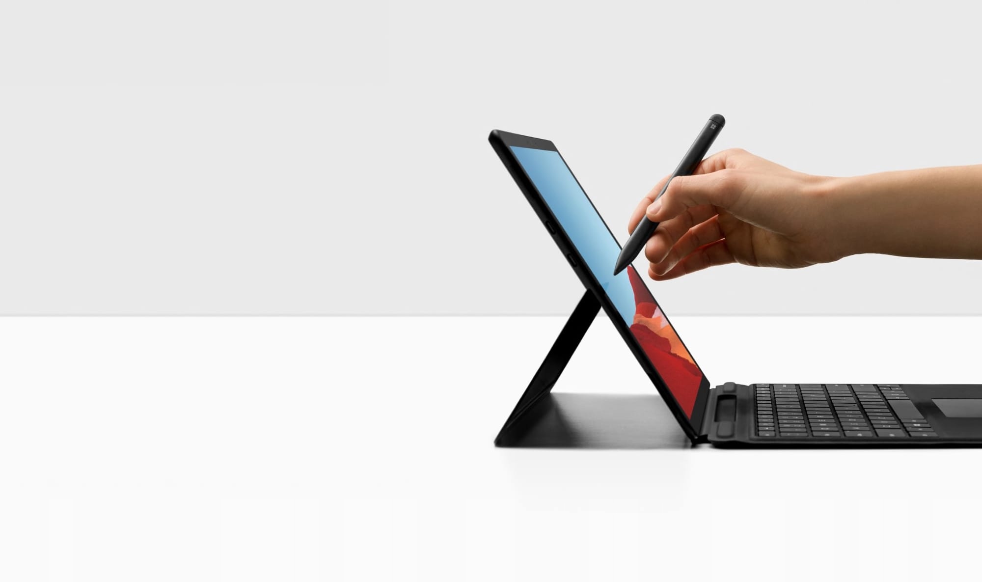MICROSOFT SURFACE PRO X, оснащенный потрясающим графическим 13-дюймовым безрамочным сенсорным экраном и чрезвычайно быстрым подключением к сети Wi-Fi.