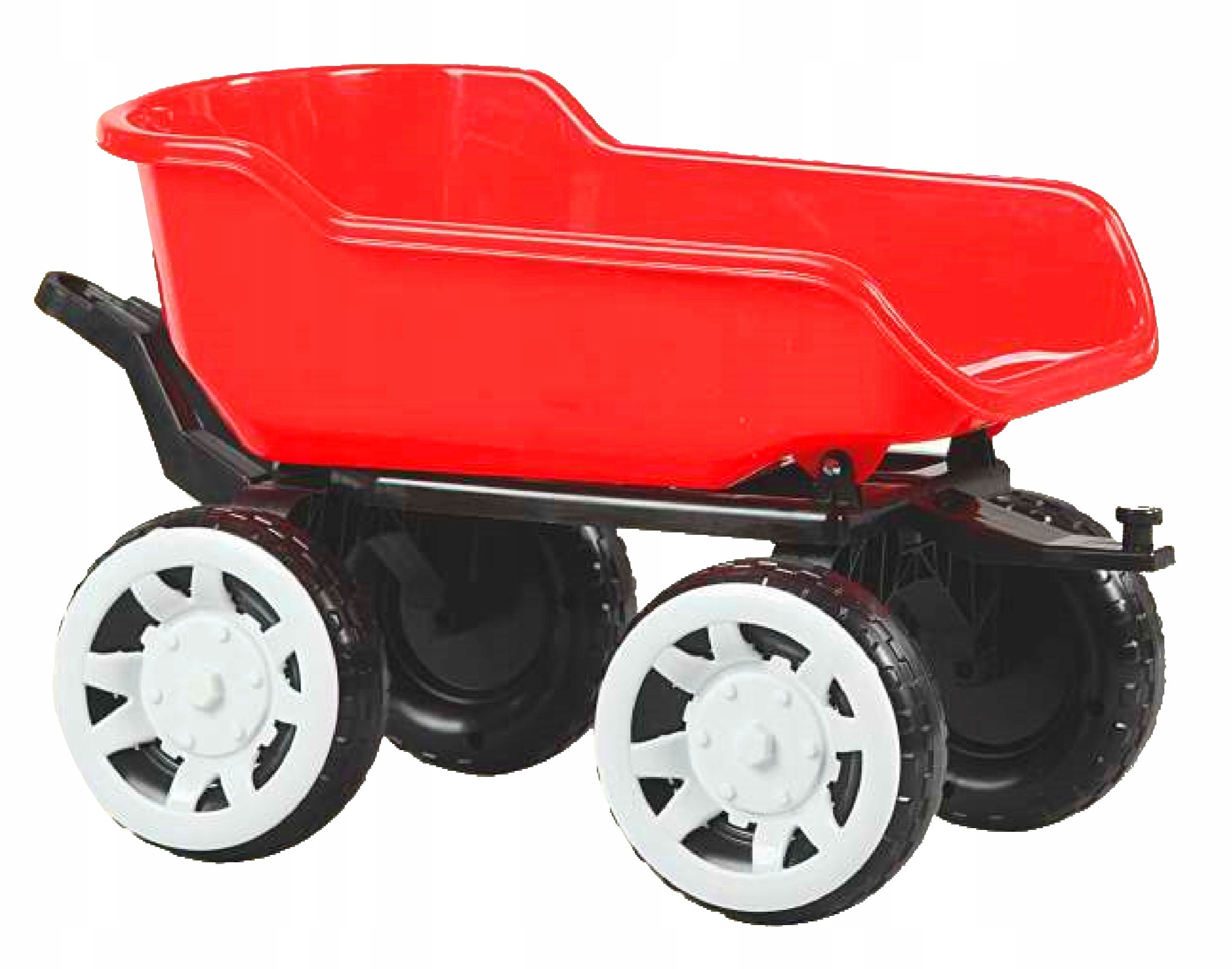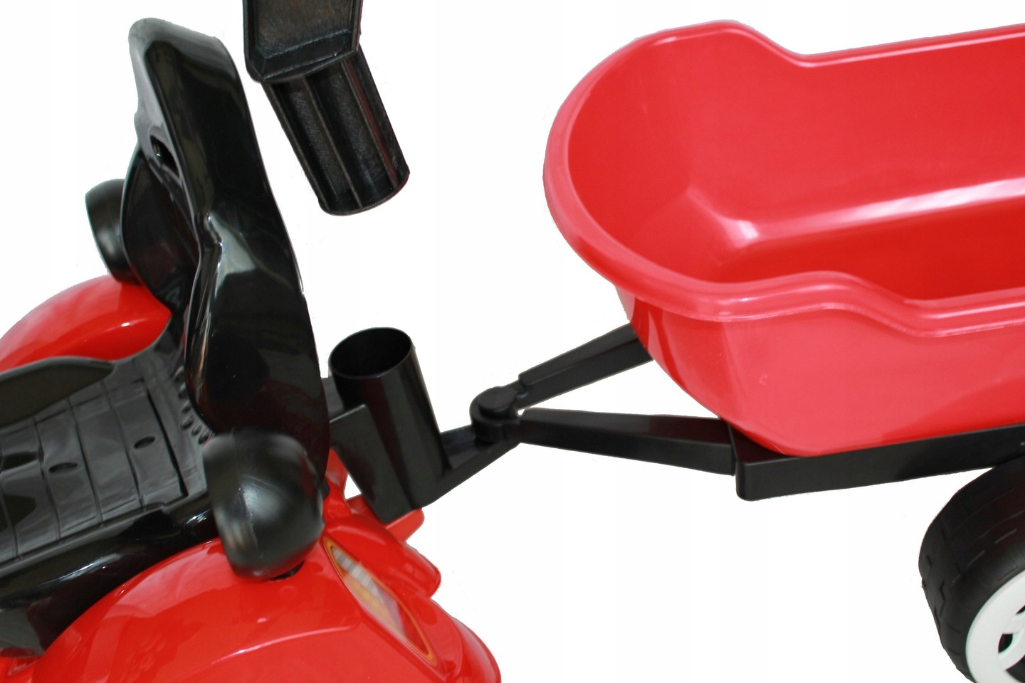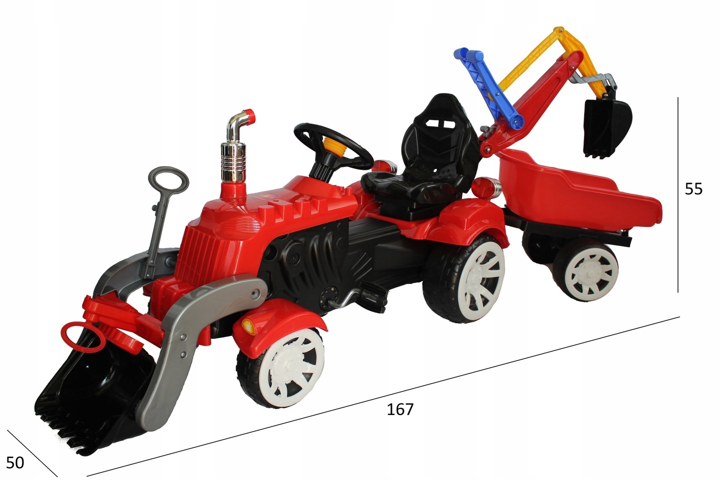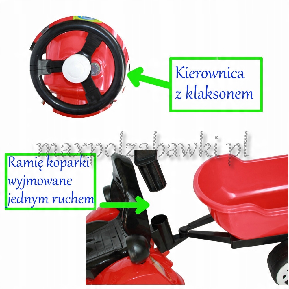 Большое, удобное и устойчиво установленное сиденье со спинкой обеспечивает комфортное положение ребенка при вождении и работе. Широко расставленные и большие колеса делают игрушку устойчивой и безопасной, а передвижение по песку или другой местности не составит труда. Управление передней осью осуществляется посредством рулевого колеса, оснащенного звуковым сигналом. В число дополнительных гаджетов входят фары, дымоход, колпаки на колеса и крюк, благодаря которым трактор напоминает настоящий автомобиль. К трактору можно присоединить прицеп, который оснащен передвижным погрузочным кузовом, что облегчает его быструю разгрузку.