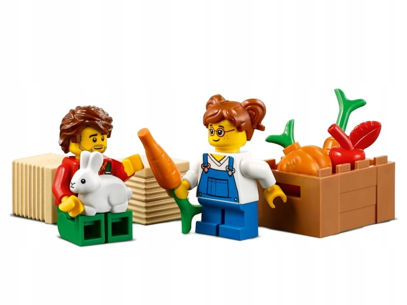 • Что в коробке? Дети найдут все элементы, чтобы построить игрушечный трактор с множеством реалистичных функций. Есть также два тюка сена, коробка блоков, притворяющихся овощами, фермерские минифигурки, его дочь и статуэтка кролика.