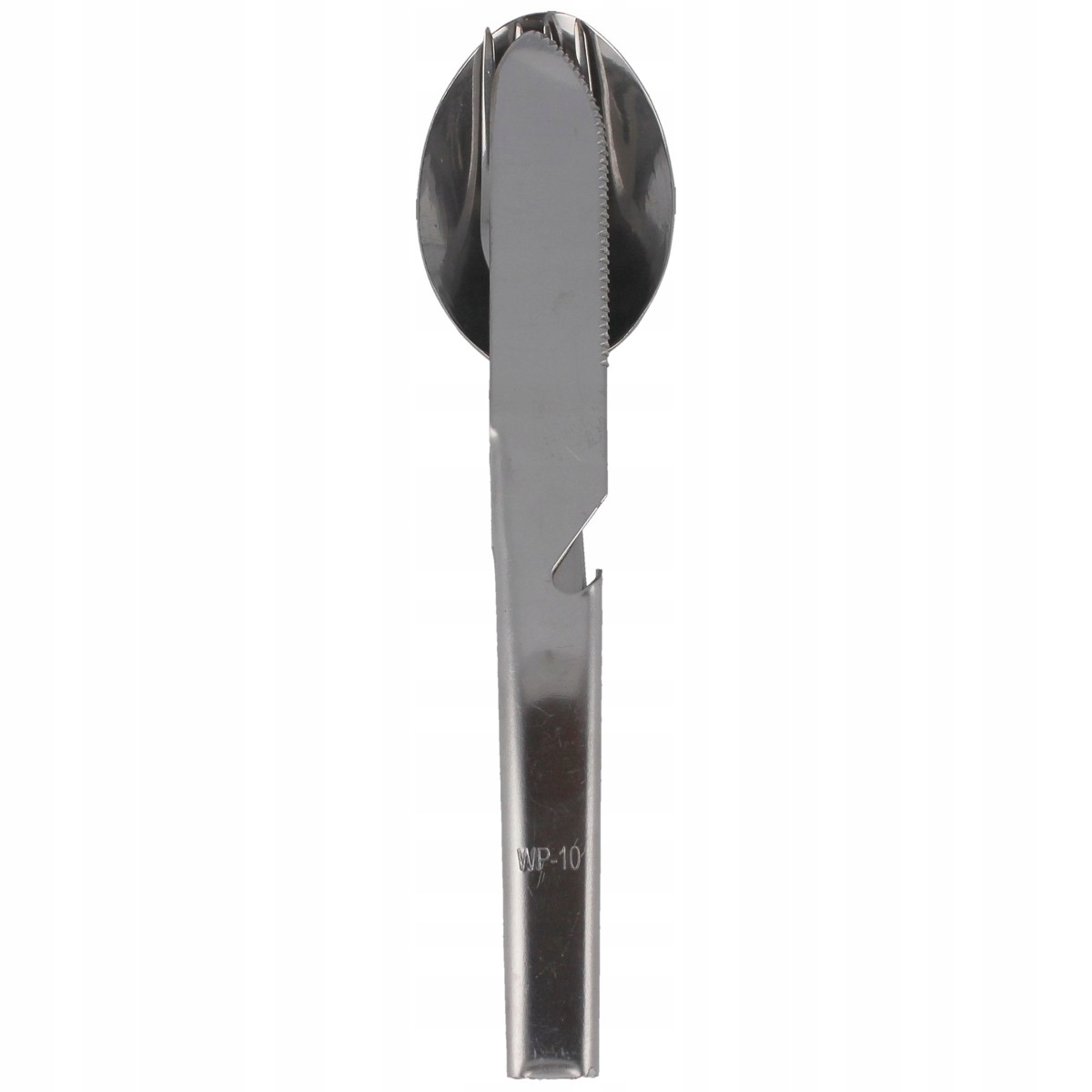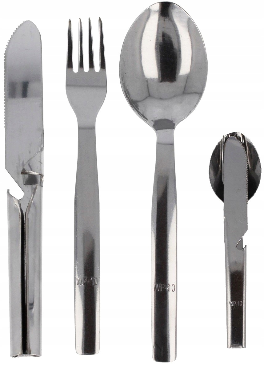 Классический, простой в сборке набор, состоящий из ложки, вилки и ножа с пилкой. Дополнительно нож имеет открывалку для бутылок и консервный нож, его можно использовать как ручку для польской военной фляги - что предотвращает ожоги о горячий сосуд. После сборки набора (внутри подкладки ножа) ящик для инструментов занимает мало места. Удобный и прочный, изготовлен из легко чистящейся полированной нержавеющей стали.