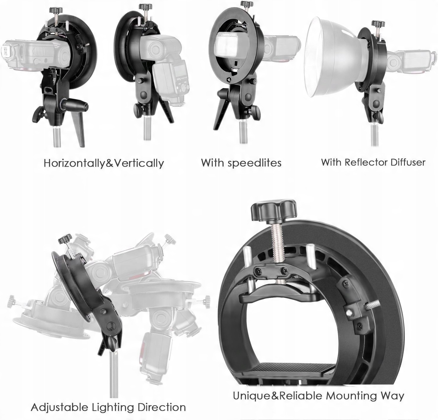 Хватит раздражаться из-за неудобных и дублирующихся L- или T-образных креплений для вспышек Speedlite! Это уникальное крепление для вспышек Bowens S-mount представляет собой идеальное сочетание и усовершенствование креплений Speedlite L- и T-типа. Регулируемый размер крепления, подходит для вспышек Speedlite ВСЕХ БРЕНДОВ и некоторых устройств, конструкция которых аналогична вспышкам Speedlite, таких как вспышки Speedlite (Nikon SB910 SB900, Canon 600EX, 580EX/II, 550EX/II и т. д.), косметическая тарелка (поддерживается крепление Bowens), светоотражающий зонт. и СКОРО!