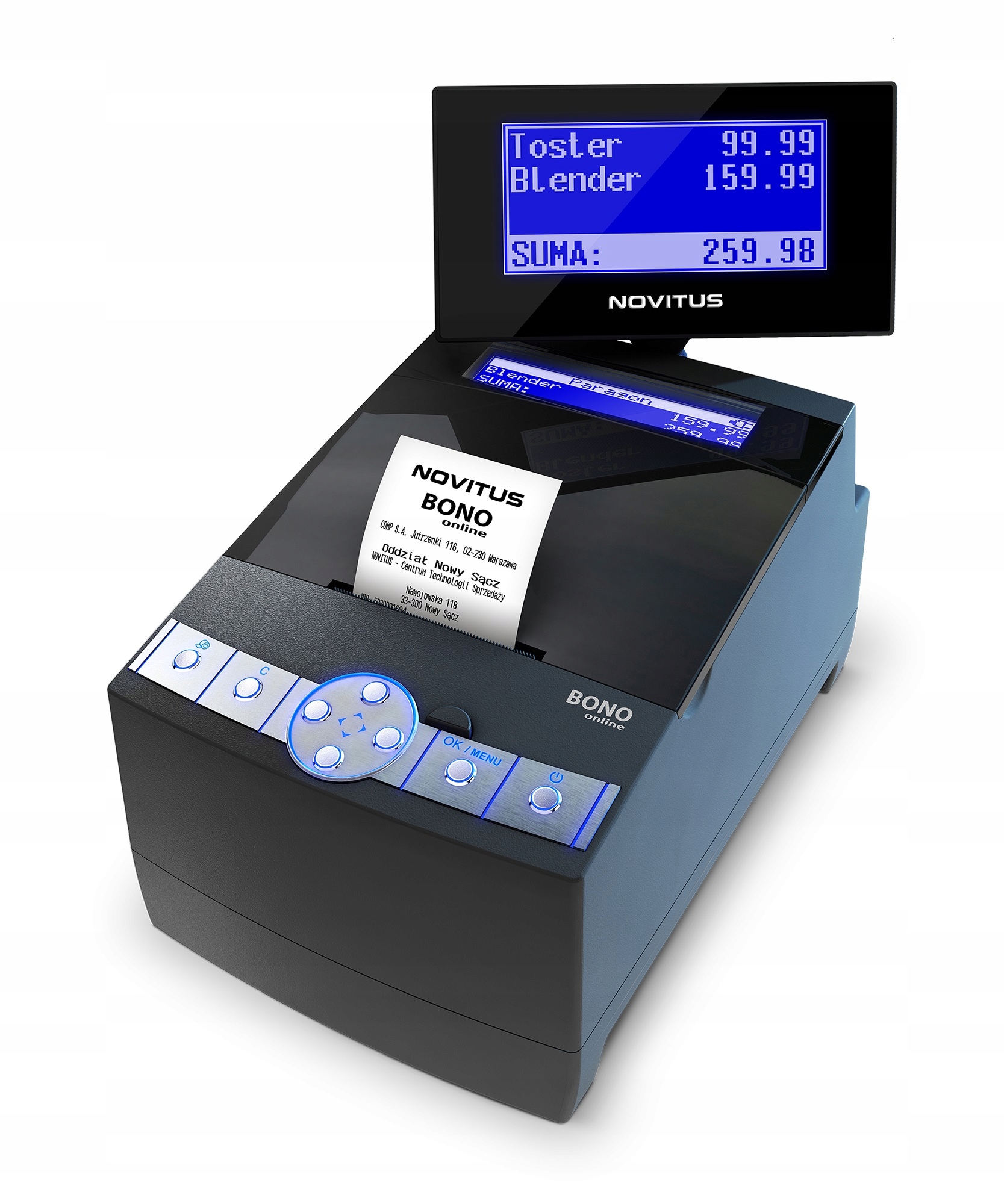 Кискальный принтер BONO Online — это современная технология, заключенная в удобный и Эргономичный корпус предназначен для малых и средних торговых точек, где продажи ведутся с помощью компьютерной программы, а бюджетным дополнением к этой станции станет принтер. Функциональные особенности принтера (например, механизм печати «нажми и работай», печать счетов-фактур НДС непосредственно на печатающем механизме, мультивалютность), его параметры и используемые проверенные решения, обеспечивающие высокую надежность, ставят BONO Online среди принтеров самого высокого стандарта. . Как и любой фискальный принтер Novitus, Bono Online также имеет возможность распечатывать счета-фактуры с НДС на своем печатающем механизме.