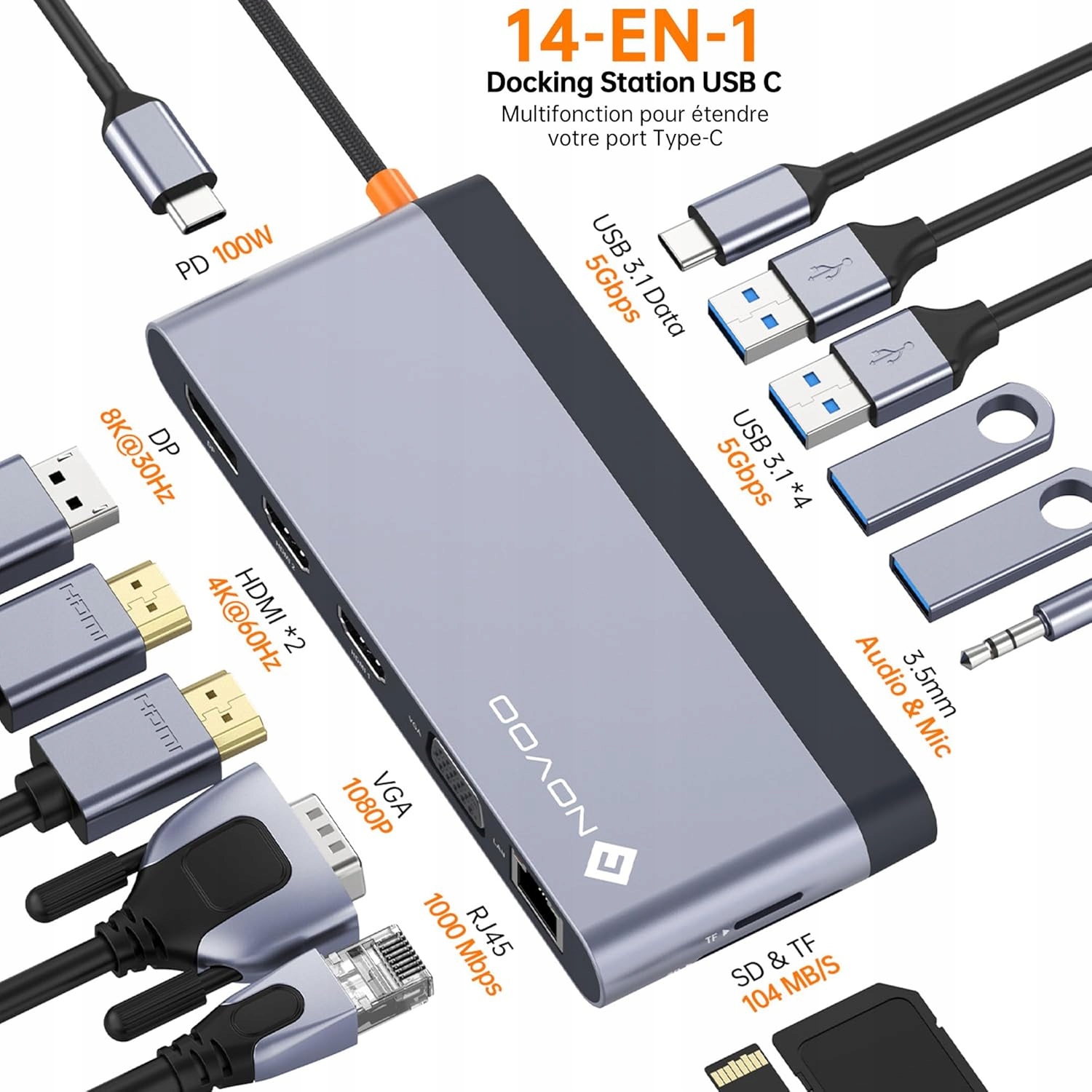 Двойной монитор док -станции Novoo, два HDMI 4K 60 Гц, Displayport, VGA, Gigabit Ethernet, PD 100W, USB X5, SD/TF и 3,5 -мм аудио, док -станция для MacBook HP Lenovo Dell