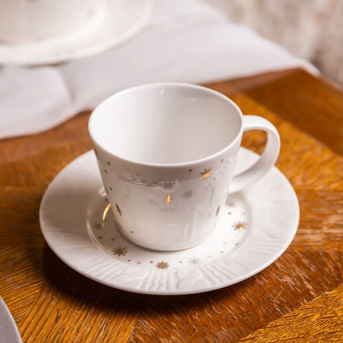 Чашка NBC 240 мл с блюдцем диаметром 15 см и ремешком – настоящее рождественское сокровище. На чашке и тарелке нежный узор в виде свитера, который создает теплое зимнее настроение. Под краем свитера на тарелке тонкий слой, украшенный золотыми и серебряными звездами и елочками - как будто по каждому краю осел волшебный снег. В дополнение к этим рождественским акцентам чашка также украшена рисунками оленей и милыми домиками – все в минималистском, теплом стиле свитера. Идеально подходит к утреннему кофе или ароматному чаю, создавая праздничное настроение с каждым глотком.